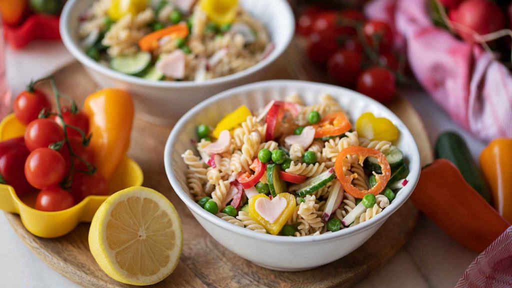 Frisch, bunt und kinderleicht: In diesen Salat kommen neben den Dinkel Mini Dralli auch Paprika und Schinken in Herzform. Die dürfen die Kinder direkt selbst ausstechen – so macht das gemeinsame Vorbereiten und Essen gleich noch mehr Spaß.