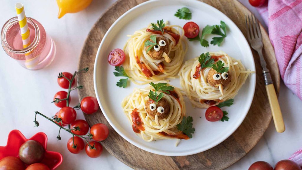 Knusprige Gemüsebällchen werden mit Cashews als Schnäbel und Mozzarellaaugen in lustige Vogerl verwandelt, die es sich in ihren Spaghetti-Nestern mit milder Käsesauce gemütlich gemacht haben. Ein liebevoller Hingucker, der garantiert für gute Laune am Ostertisch sorgt.