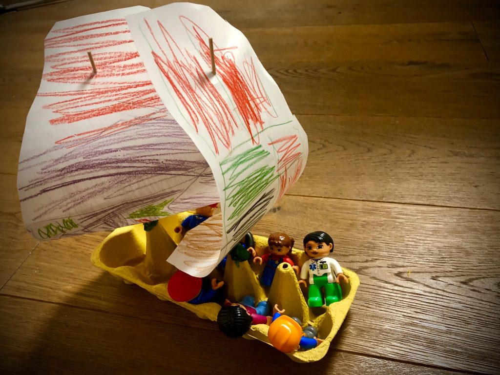 7. Fertig ist das Segelboot oder Piratenschiff. Jetzt können die Passagiere oder Piraten an Board gehen.