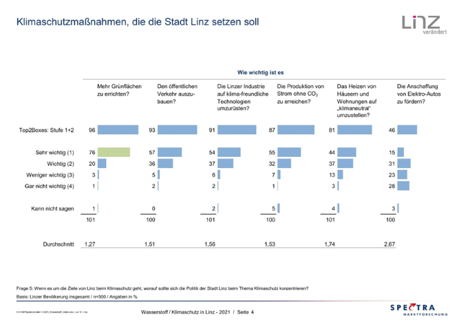 aut der aktuellen Umfrage von Spectra stößt der Ausbau von erneuerbaren Energiequellen in der Bevölkerung auf besonders großen Zuspruch: Für 87 % der Linzerinnen und Linzer ist es „wichtig” oder „sehr wichtig”, dass die Stadt sich auf die Produktion von Strom ohne CO2 konzentriert. „In der Altersgruppe unter 30 Jahren sind es sogar 94 %. Es gibt also nur noch wenige Menschen in Linz, die das nicht für notwendig halten,” so Klaus Nemetz von Spectra.