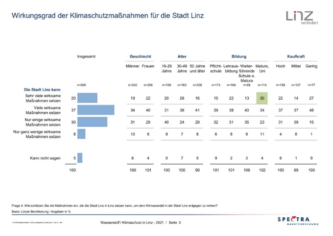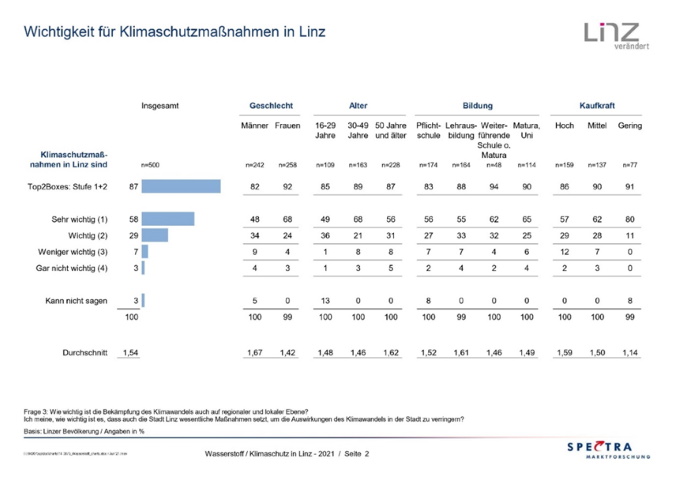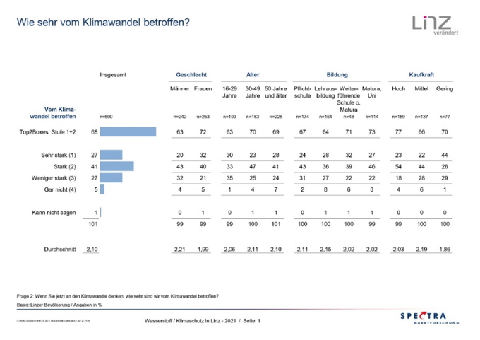 Ein vorausschauender Umgang mit der Klimakrise zeigt sich als wichtiger Einflussfaktor für die Lebensqualität. 500 LinzerInnen nahmen an der Umfrage zum Klimaschutz teil und gaben ihre Meinung zu den Auswirkungen des Klimawandels in Linz sowie zu den entgegenwirkenden Maßnahmen bekannt. 68 Prozent der Befragten teilen die Meinung, dass die Stadt Linz bereits stark oder sehr stark vom Klimawandel und dessen Folgen betroffen ist. Deutlich mehr LinzerInnen (87 %) vertreten die Auffassung, dass die Stadt „wesentliche Maßnahmen” zum Schutz des Klimas (d.h. Treibhausgase vermeiden) setzen soll. „Das Bewusstsein für den Klimaschutz ist in der Mitte der Gesellschaft angekommen und zieht sich durch alle Berufs- und Altersgruppen”, interpretiert Klaus Nemetz vom Forschungsinstitut Spectra die Ergebnisse.