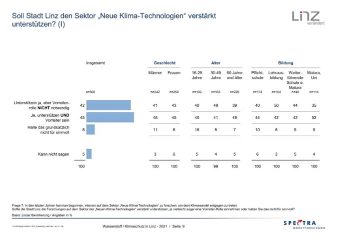 Wie soll sich die Stadt Linz im Hinblick auf das Thema „Neue Klima-Technologien“ verhalten? Sollte die Stadt Linz die Forschungen auf dem Sektor der „Neuen Klima-Technologien“ verstärkt unterstützen, ja vielleicht sogar eine Vorreiter-Rolle einnehmen oder ist das nicht sinnvoll? Die Bevölkerung spricht sich eindeutig und mit großer Mehrheit für die Unterstützung der Forschung aus. Knapp die Hälfte (45%) plädiert sogar dafür aus, dass Linz auf diesem Sektor eine Vorreiterrolle spielen soll. Ein gleich großes Segment (42%) tritt ebenfalls für eine Unterstützung ein, allerdings ohne Vorreiterrolle.