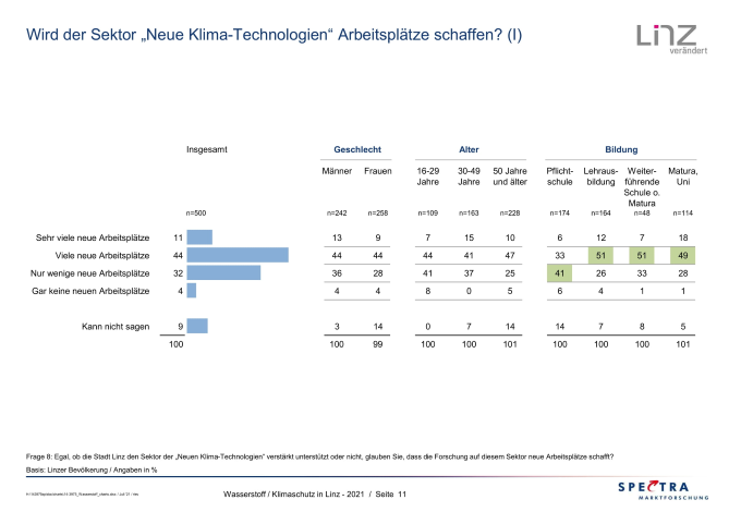 Insgesamt gehen fast neun von zehn LinzerInnen davon aus, dass die städtische Unterstützung auf dem Sektor der „Neuen Klima-Technologien“ neue Arbeitsplätze schafft. Gut die Hälfte der LinzerInnen (55%) kann sich sogar vorstellen, dass (sehr) viele neue Arbeitsplätze entstehen.