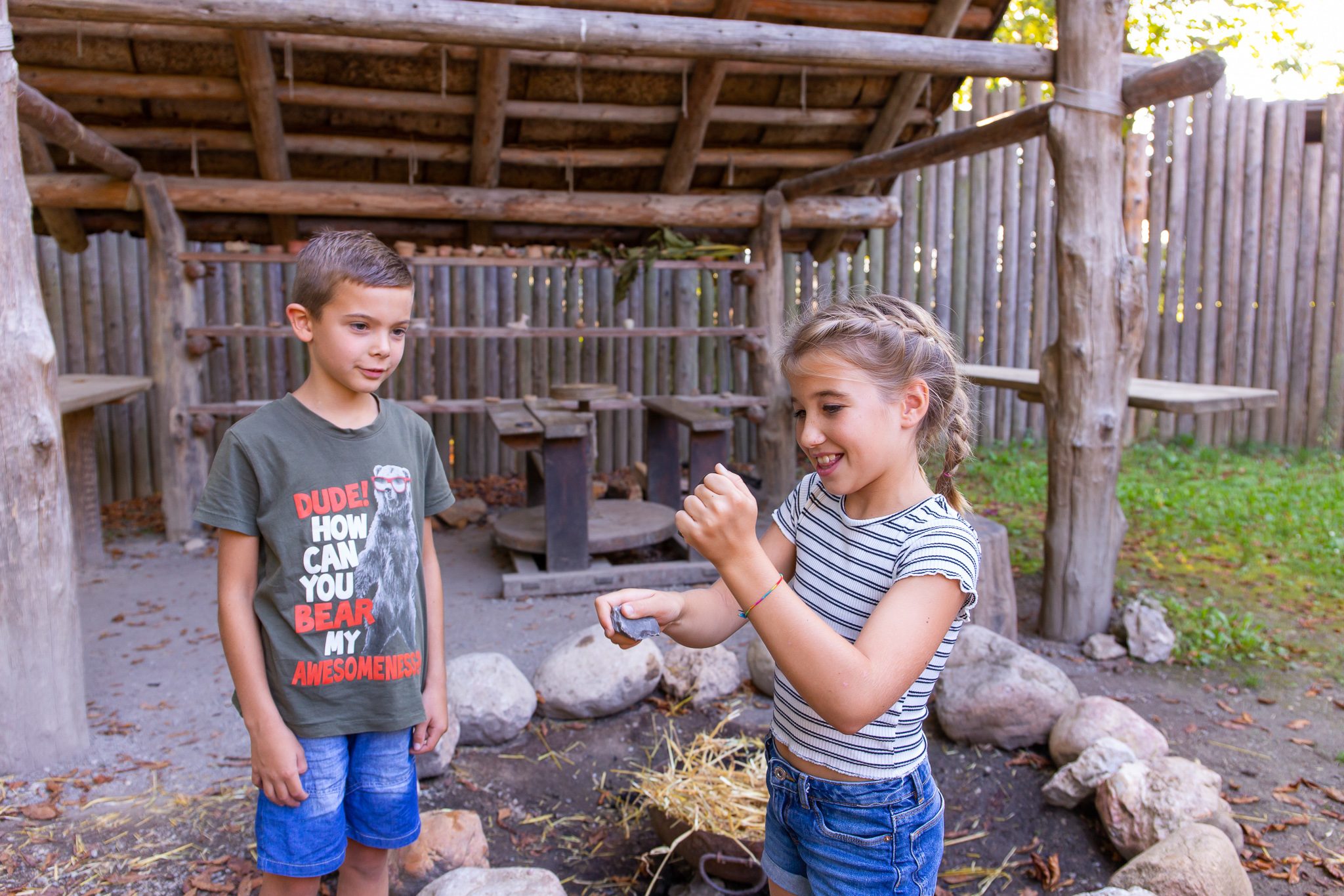 Von 15 bis 16 Uhr werden die Metallzeiten erkundet. In den bronze- und eisenzeitlichen Werkstätten kann Funken schlagen selbst ausprobieren werden. Wer schafft es, ein Feuer zu entfachen?