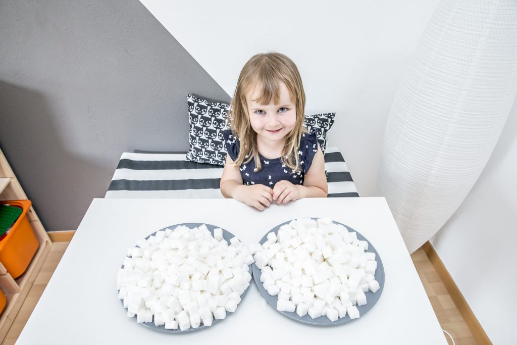 Würfel für Würfel schichtet die dreijährige Kira den Zucker auf Teller. Am Ende sind es zwei beachtliche Türmchen, die sie selbst kaum überblickt. 609 Stücke Würfelzucker. Exakt jene Menge, die in einem Wocheneinkauf der vierköpfigen Familie steckt. „Dabei versuchen wir, möglichst ausgewogen und gesund einzukaufen“, wundert sich Mutter Nico. „Süßigkeiten kommen zum Beispiel nur in Ausnahmefällen auf den Tisch.“ Dennoch: Wollten die Königs die von der Weltgesundheitsorganisation WHO empfohlene Wochenration an Zucker einhalten, müssten sie knapp 380 Stücke Zucker reduzieren – und damit auf viele der einkauften Lebensmittel verzichten.