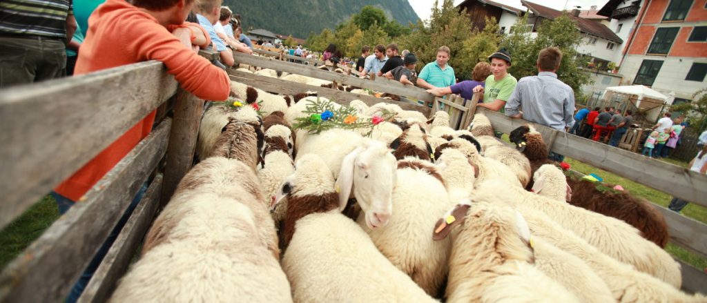 Ein außergewöhnliches Bild zeigt sich am Sonntag, den 8. September in Tarrenz bei Imst in Tirol: Beim Tarrenzer Schafschied ziehen rund tausend Schafe durch die langgezogene, enge Trujegasse. Einige von ihnen sind „aufgebuscht“, mit Fichtenbüscheln und Blumen aus Krepp-Papier geschmückt. Echte Blumen würden die Schafe nämlich auffressen.