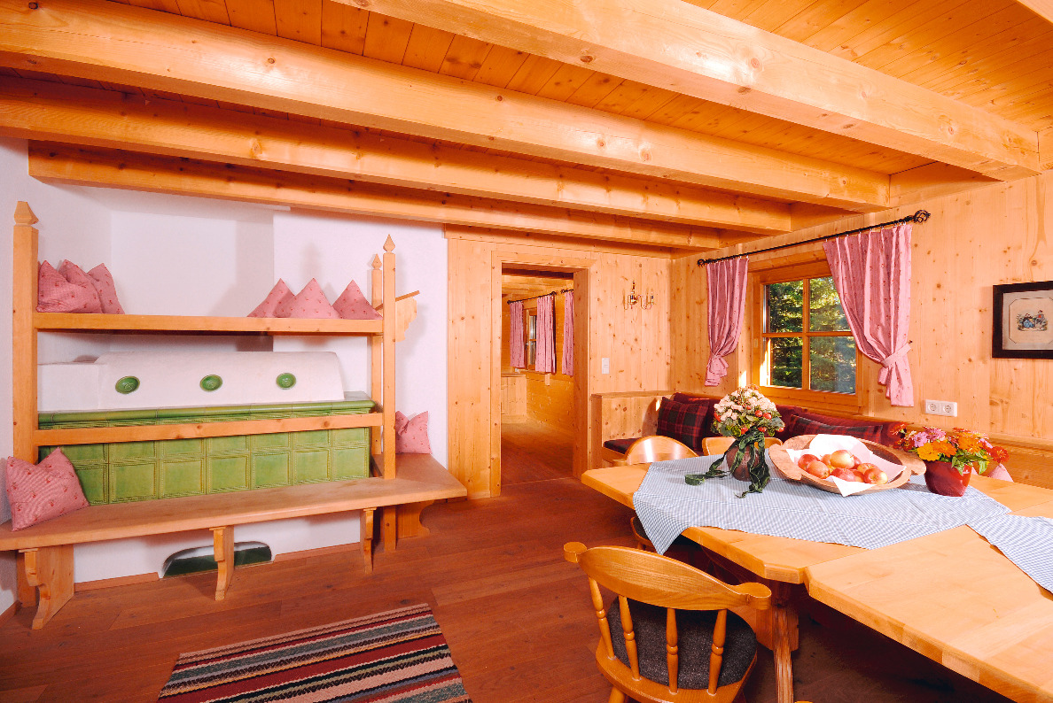 Die Küche ist mit Holzherd, Kühlschrank, Kaffeemaschine, Wasserkocher und einem großen Esstisch ausgestattet. In der Stube laden die Sitzecke und der Kachelofen zum gemütlichen Herumlümmeln ein. Für Kinder gibt es im Freien eine Schaukel und einen Brunnen zum Pritscheln.