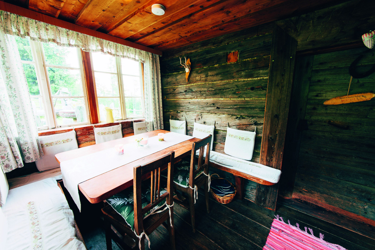 Highlight der Hütte ist neben der spektakulären Naturkulisse sicher die lauschige Terrasse mit Sitzgruppe, Gartengrill und typischem Holzbrunnen. Herrlich faulenzen kann man auch auf den Holzbankerln auf den Balkonen. Urig geht es auch in den Wohnräumen her: da dürfen die traditionellen Fleckerlteppiche und die rot-weißkarierte Bettwäsche freilich nicht fehlen.