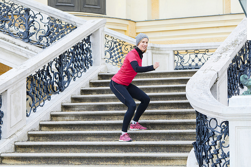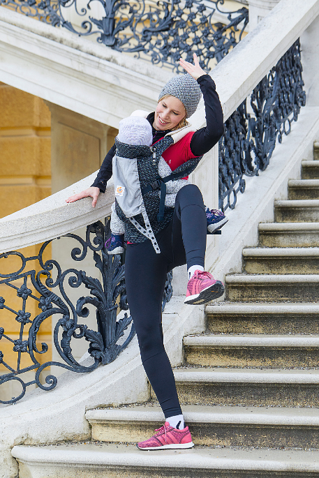 Diese, nennen wir es „Phase“, kennen viele Mamas: Das Baby schläft untertags „nur“ in Bewegung ein, im Fall der Autorin eben sehr häufig beim Spaziergang, insbesondere beim Stufensteigen und meist in der Tragehilfe. Diese Stunden auf den Treppen im Schlosspark oder im Stiegenhaus können durchaus langweilig werden. Dabei lassen sich Stufen während des Spaziergehens oder bei der Einschlafroutine sehr gut als Trainings“gerät“ einsetzen. Die tägliche Outdoor-Stiegen-Session stärkt dann nicht nur Immunsystem, sondern auch Ausdauer und Kraft. Nebenbei werden noch Beinmuskulatur, Po, Rumpf und Bauch in Form gebracht. Kalorien werden beim Stufenworkout als netter Nebeneffekt sehr effizient verbrannt. Schon 20–25 Stufen reichen, um ein Stufenworkout absolvieren zu können.