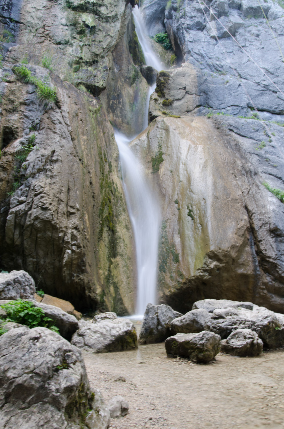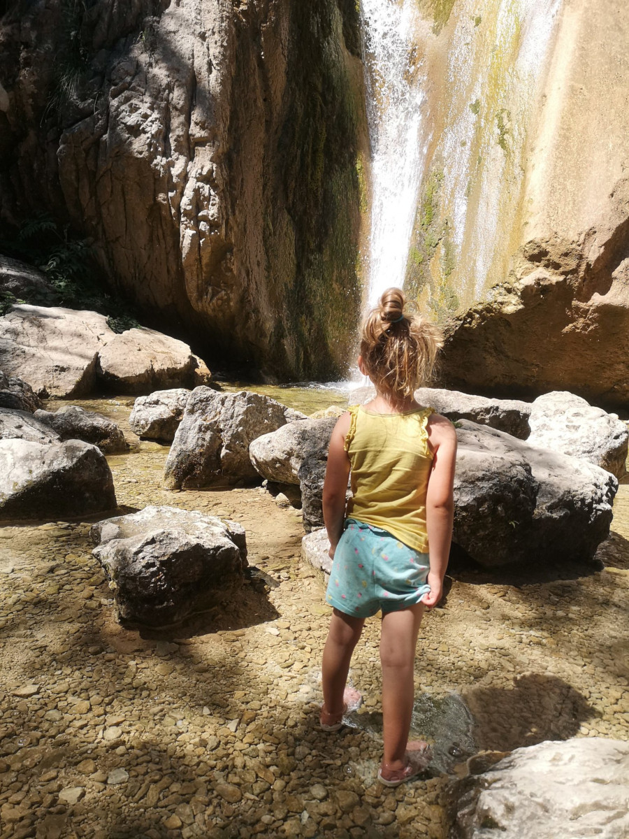 Die Wurzeln am Ende des kurzen Wegs sorgen noch einmal für ein wenig Abwechslung (und dafür, dass der Weg dann doch nicht für Kinderwägen geeignet ist), bevor wir das große Highlight erreichen: den Wasserfall. Schon kurz davor hören wir die Wassermassen, die in die Tiefe stürzen. Am Wasserfall angekommen setzen wir uns auf die kleine Brücke, die über den Bach führt und beobachten das Schauspiel. Genießen kurz die kühle Brise und Erfrischung bevor wir noch weiter gehen. Schritt für Schritt waten wir durchs kalte Wasser, klettern über kleine Stromschnellen und Steine. Unsere jüngste Tochter begnügt sich damit, kurz einen Zeh ins Wasser zu halten und sich lieber von Mama tragen zu lassen. Die Große geht begeistert und mit nötiger Vorsicht voran. Immer näher zum Wasserfall, bis wir direkt davorstehen. Knietief, im eiskalten Wasser.