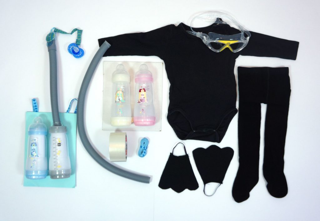 Mit einem selbst gebastelten Taucher-Kostüm bleibt jedem – außer dem Baby, dank kreativer Sauerstoffflasche – vor Entzückung die Luft weg. Auch dieses Kostüm ist im Handumdrehen fertiggestellt.
