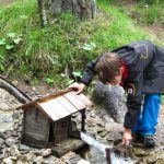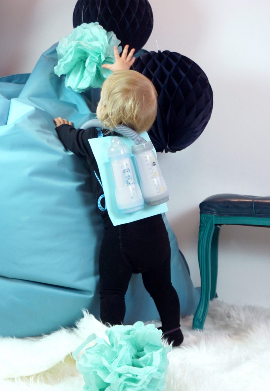 - Währenddessen einen alten Schlauch auf ca. 30cm kürzen (hängt von der Größe des Babys ab) und auf der einen Seite einen Schnuller-Clip befestigen. Die andere Seite an einer der Babyflaschen fixieren – fertig ist der Sauerstoff-Rucksack.