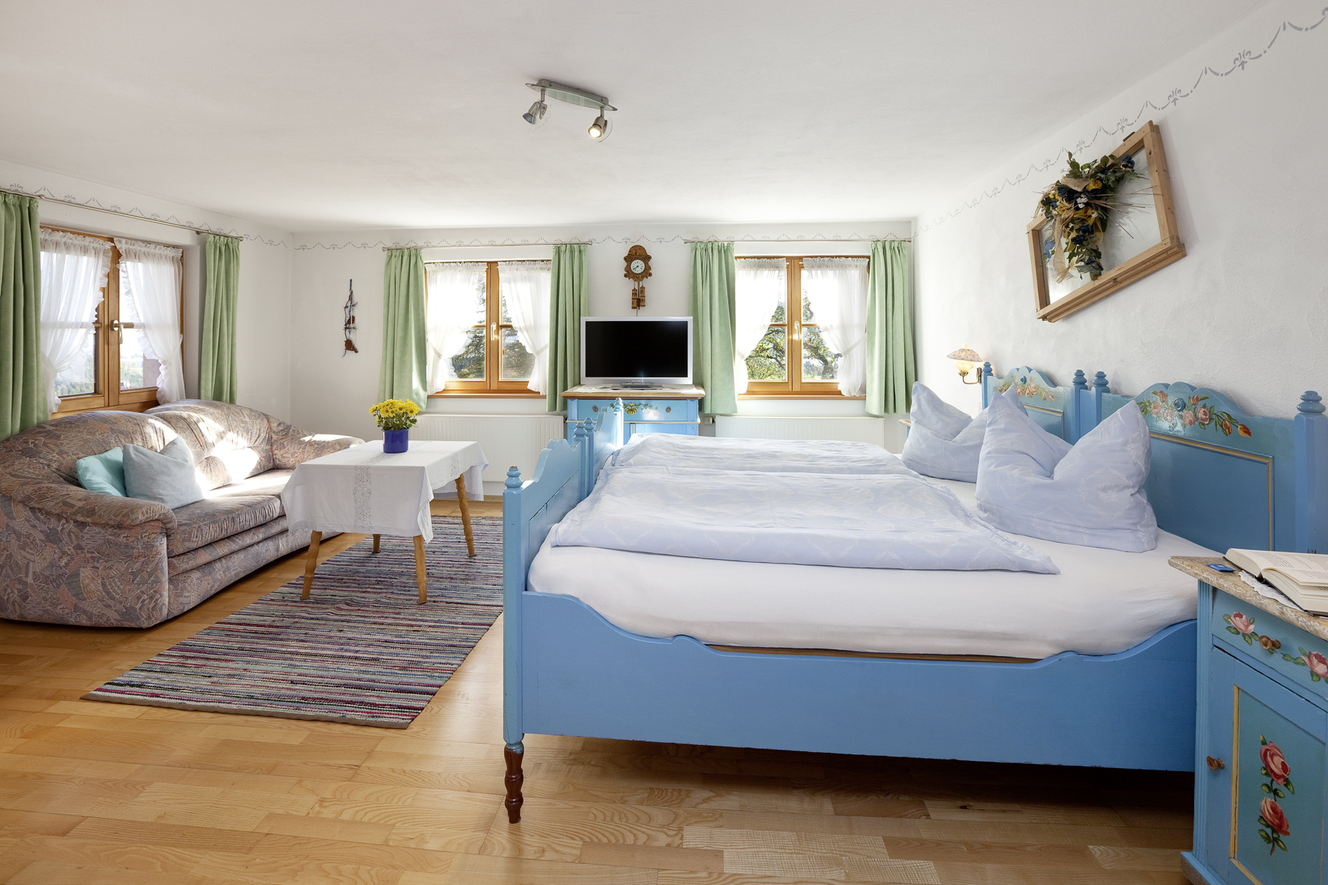 Wenn arktische Schneewolken über das Bayernland fegen, stellt sich ihnen als erstes Hindernis nicht etwa die Zugspitze in den Weg, sondern der Bromberg. Zugegeben: Der Bromberg zwischen Murnau und Peiting ist mit seinen 900 Metern Seehöhe eher ein Hügel. Dennoch gilt er bei Familien mit Kindern und bei Ski-(Neu-) Einsteigern als Geheimtipp. Nur einen Schneeballwurf entfernt liegt der Bussjägerhof. Welcher Urlaubshof kann schon von sich behaupten, einen eigenen Lift vor der Hoftür zu haben? Der Bussjägerhof kann! Hier sausen glückliche Kinder auf Ski und Schlitten den Bromberg hinunter. Und das Beste: Wenn ihnen kalt wird, wärmen sie sich in Null Komma Nix am Kachelofen in der Wohnung, während dem Papa, der sich beim Brennholzhacken verausgabt hat, schon längst pudelwarm ist. Aber manch einem ist das vielleicht noch immer nicht genug Action. Dann also entweder Schlittschuhe schnüren und rauf auf den gefrorenen Biopool zu einer fetzigen Eishockey-Partie oder nach dem Skifahren direkt in die Abenteuer-Scheune!