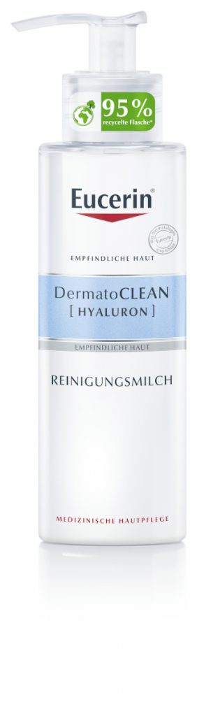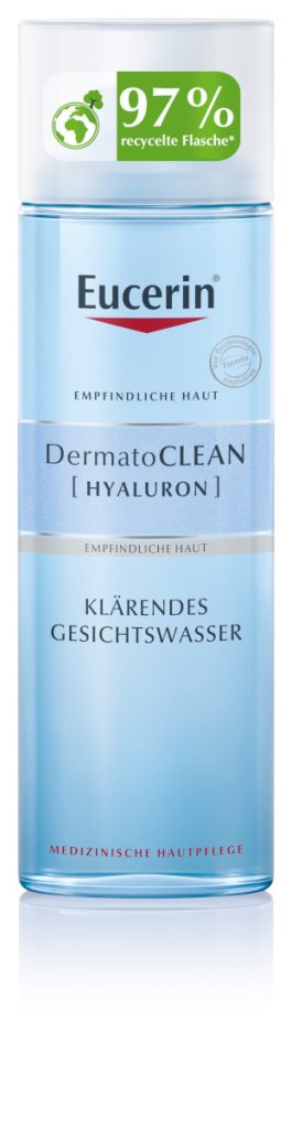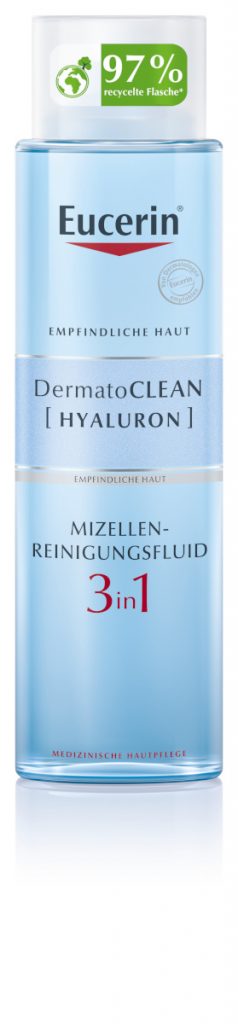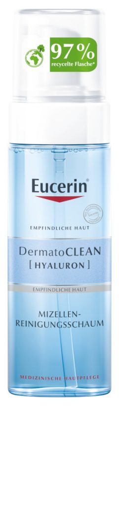 Bei der DermatoCLEAN Reihe sind das [HYALURON] Klärendes Gesichtswasser 200 ml, das [HYALURON] Mizellen-Reinigungsfluid 3 in 1 200 ml und 400 ml, der [HYALURON] Mizellen-Reinigungsschaum 150 ml sowie der Augen-Make-Up-Entferner 125 ml in zu 97 % aus recyceltem Material* bestehenden Flaschen erhältlich. Die DermatoCLEAN [HYALURON] Reinigungsmilch 200 ml ist in Flaschen verfügbar, die zu 95 % aus recyceltem Material* hergestellt sind.