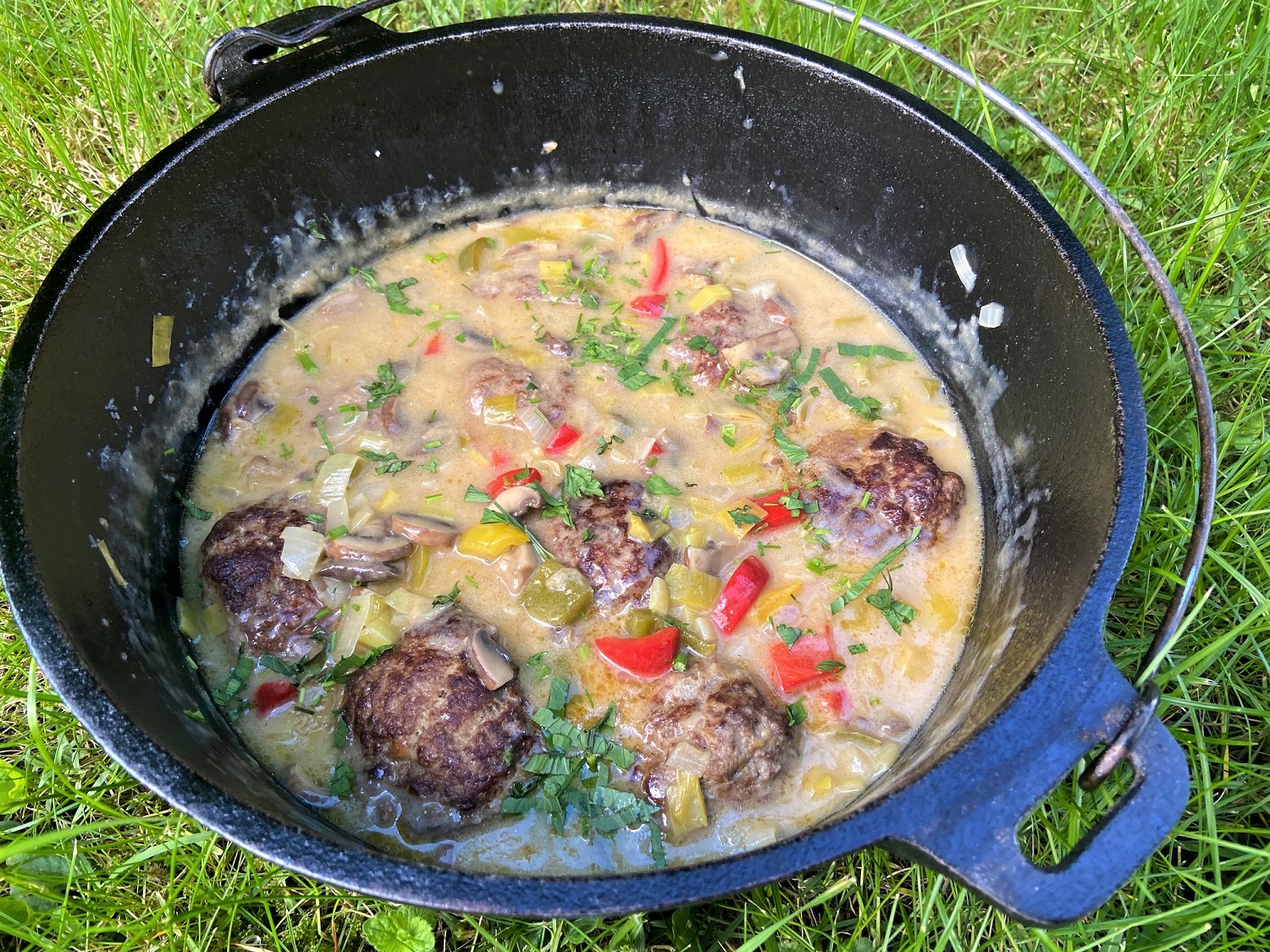 Hierbei soll auf zwei wesentliche Punkte eingegangen werden: das Fleisch und das Gemüse. Beim Fleisch kann sich jeder selber Gedanken machen, ob es Rinderhack, gemischtes Hack oder Schweinehackfleisch sein soll. Und auch bezüglich der Zutaten für die Buletten lässt sich noch mit Zwiebeln oder Petersilie spielen. Beim Gemüse für dieses Topf-Gericht müssen es auch nicht unbedingt Champignons und Paprika sein. Gut könnte ich mir auch Zucchini, Auberginen oder Cocktailtomaten vorstellen.