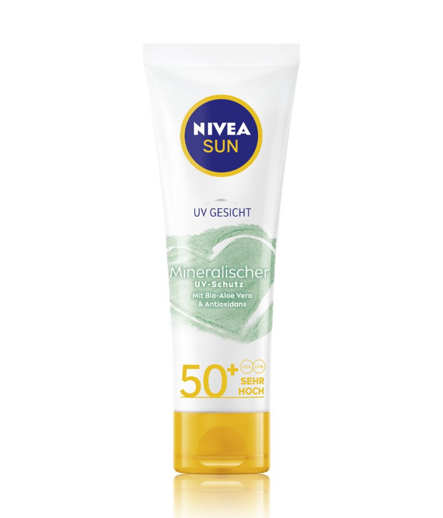Der neue NIVEA SUN Mineralischer UV-Schutz Gesicht LSF 50+ schützt die Haut effektiv vor Hautschäden sowie vorzeitiger Hautalterung. Die wasserfeste Formel ist auch für sonnenempfindliche Haut geeignet und ideal für die tägliche Anwendung. Sie ist nicht fettend, verstopft nicht die Poren und hinterlässt ein mattes Finish.