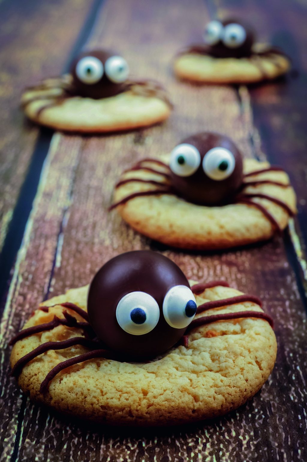 5. Schokopralinen auf die abgekühlten Kekse setzen und dabei mit etwas flüssiger Schokolade „festkleben“. Die übrige Schokolade in einen Spritzbeutel mit feiner Tülle oder in einen Gefrierbeutel mit abgeschnittener Ecke geben und damit „Spinnenbeine“ auf die Kekse spritzen.