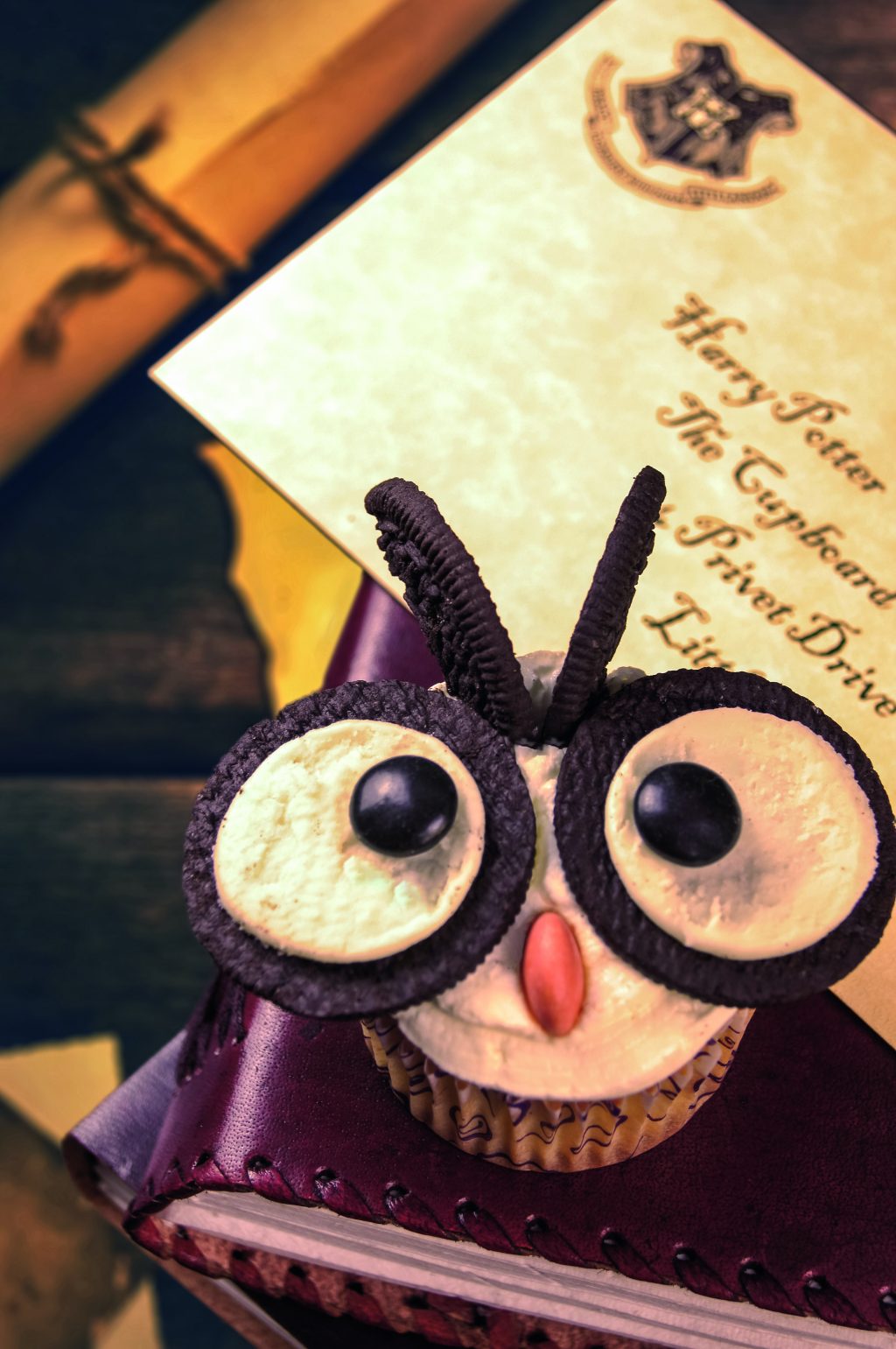 7. Je 1 schwarze Schokolinse als „Auge“ in die Creme drücken. Die halben Kekse als „Augenbrauen“ in die Creme drücken. Als Schnabel eine orangefarbene Schokolinse schräg in die Creme drücken. Vor dem Servieren alles einige Minuten fest werden lassen.