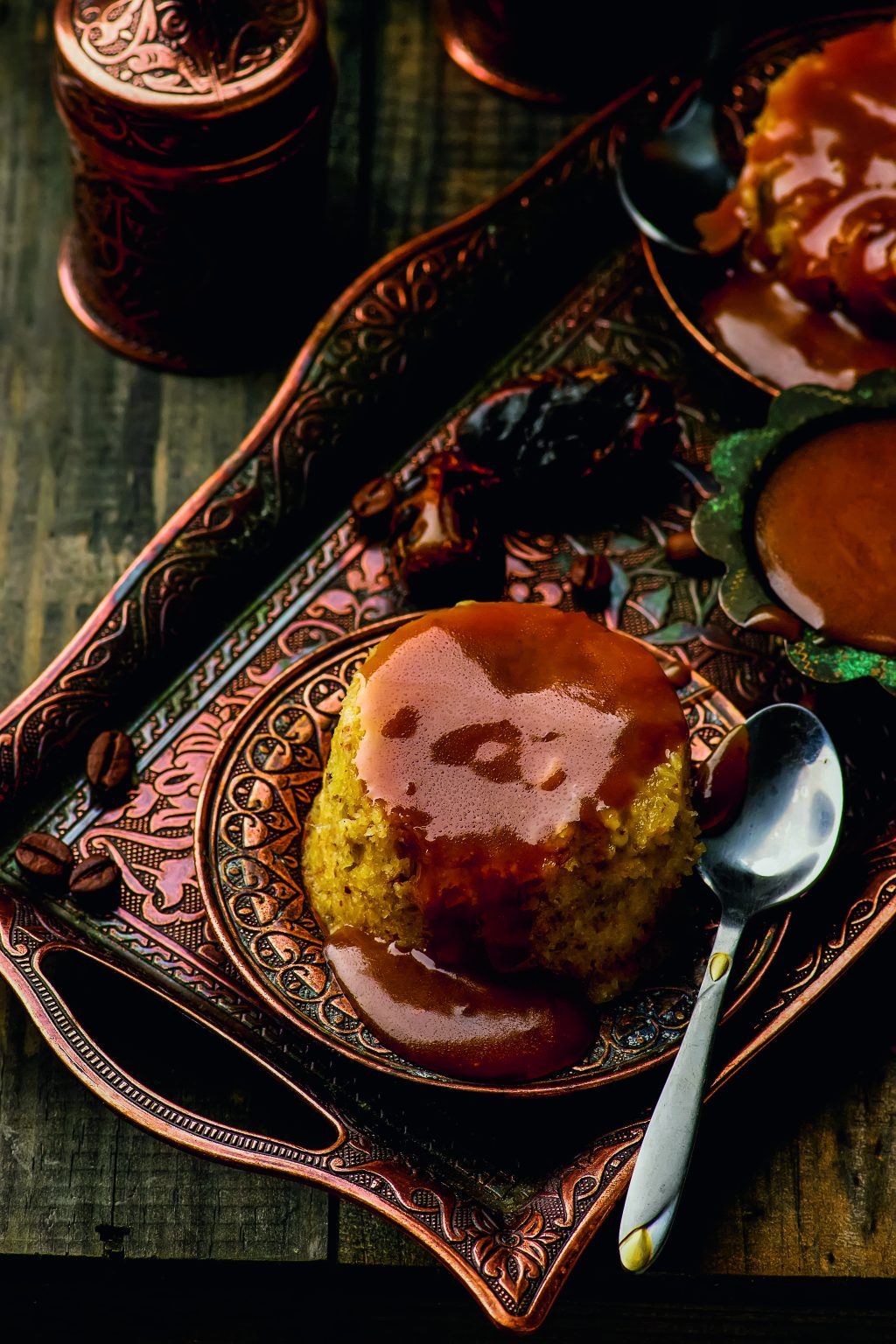 5. In der Zwischenzeit die Karamellsauce mit kurzen Schüben in der Mikrowelle erwärmen. Die Puddings aus den Formen auf Servierteller stürzen; die Masse ist so klebrig, dass sie ihre Form behalten sollten. Mit der warmen Karamellsauce übergießen und sofort servieren. Wer mag, kann dazu außerdem noch Vanilleeis reichen.