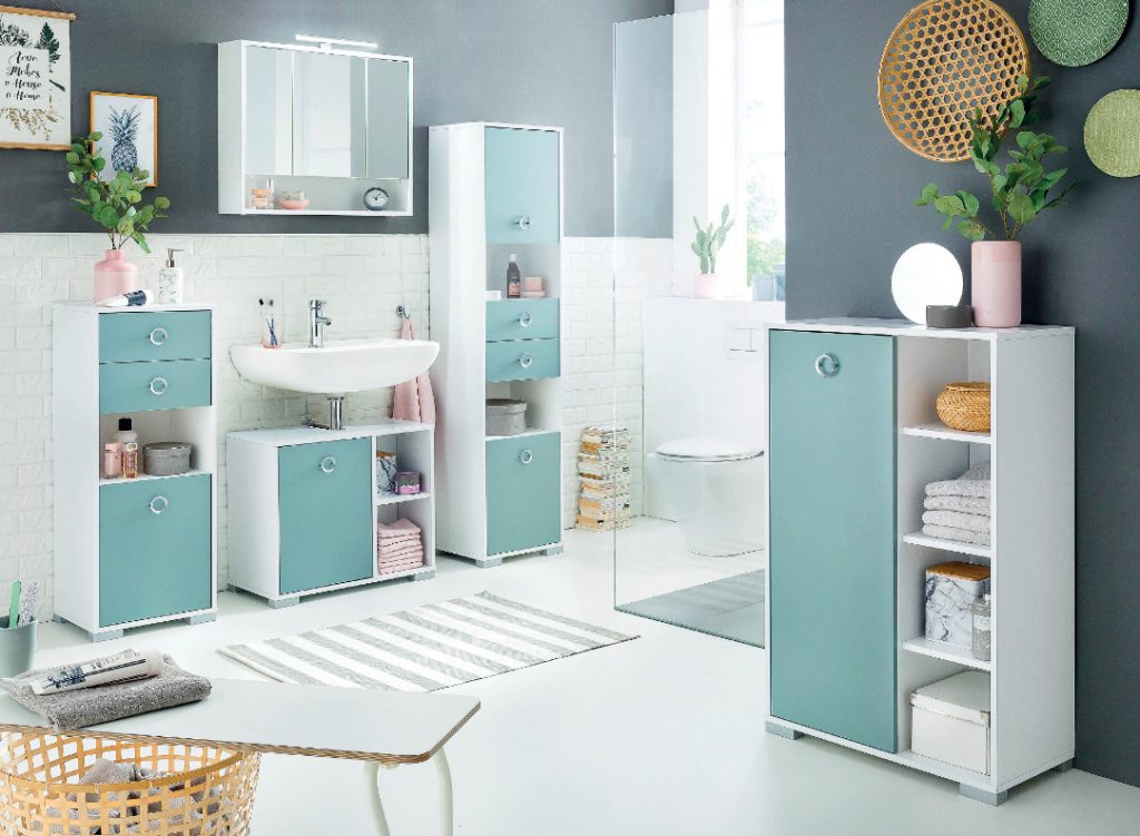 Badezimmer müssen nicht immer weiß sein. Angenehme Farbtöne bei den Möbeln, bunte Handtücher und Fußmatten sowie farbenfrohe Aufbewahrungsboxen machen das Bad im Handumdrehen zum Hingucker.