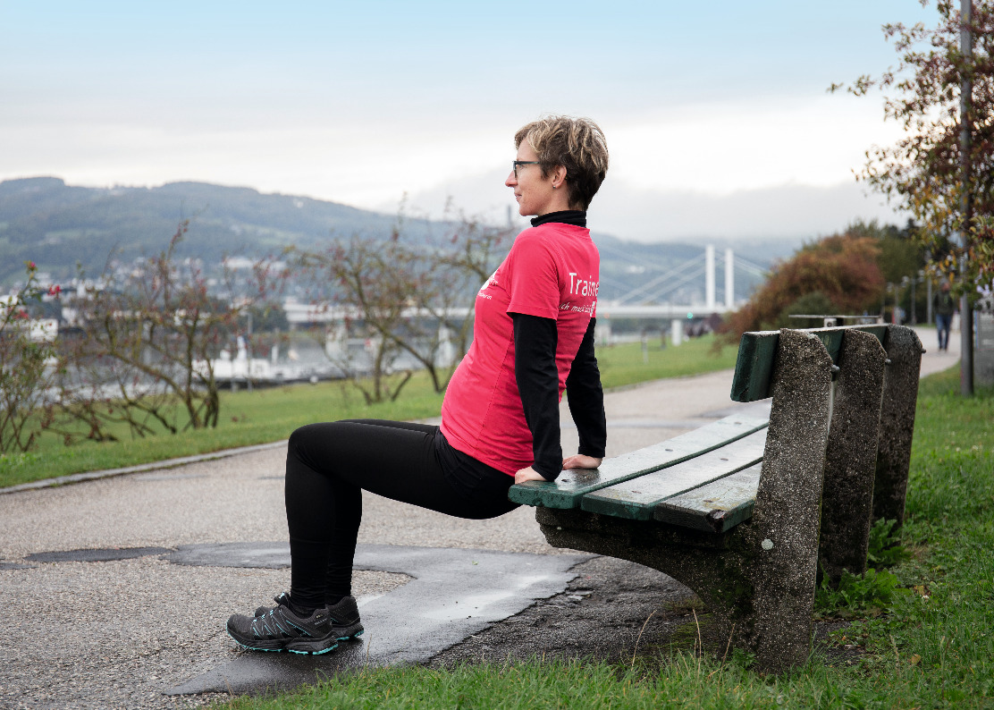 Achten Sie zudem auf gutes Schuhwerk, sodass Sie bei Nässe, Schnee oder Eis nicht rutschen. Wärmen Sie sich auf, bevor Sie mit dem eigentlichen Training beginnen. Eine gute Möglichkeit sich aufzuwärmen ist ein flotter Spaziergang – Ziel: Bank. Alternativ dazu können Sie zum Beispiel abwechselnd die Arme vor- und zurückschwingen und dabei immer leicht in die Knie gehen. Weiters lassen Sie Ihre Hüfte kreisen, wechseln Sie die Richtung. Kreisen Sie mit den Schultern nach hinten. Abschließend verschränken Sie Ihre Hände und lassen Ihre Handgelenke in beide Richtungen kreisen. Dann sind Sie gut aufgewärmt und bereit für das Bank-Training!