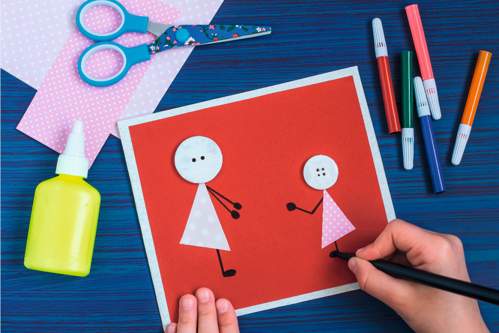 3. Aus buntem Papier entstehen Kleider; Arme und Beine malst du dazu.
