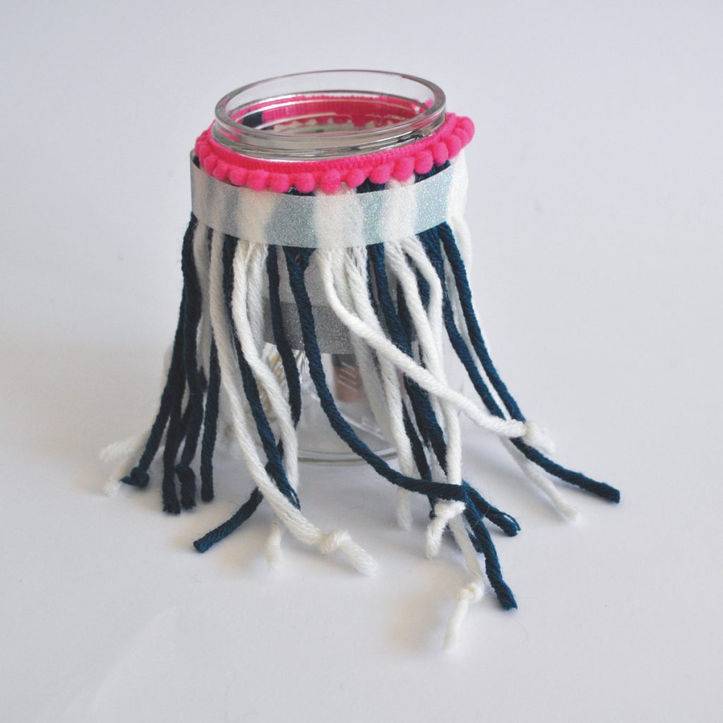 6 Schneide von den Wollfäden verschieden lange Stücke (zwischen 8 und 12 cm) ab und mache am Ende jedes Fadens einen Knoten. Klebe die Fäden bunt gemischt auf das doppelseitige Klebeband, der Knoten muss unten sein. Über dem Klebebandstreifen kannst du noch ein Dekoband um die Öffnung des Glases legen.