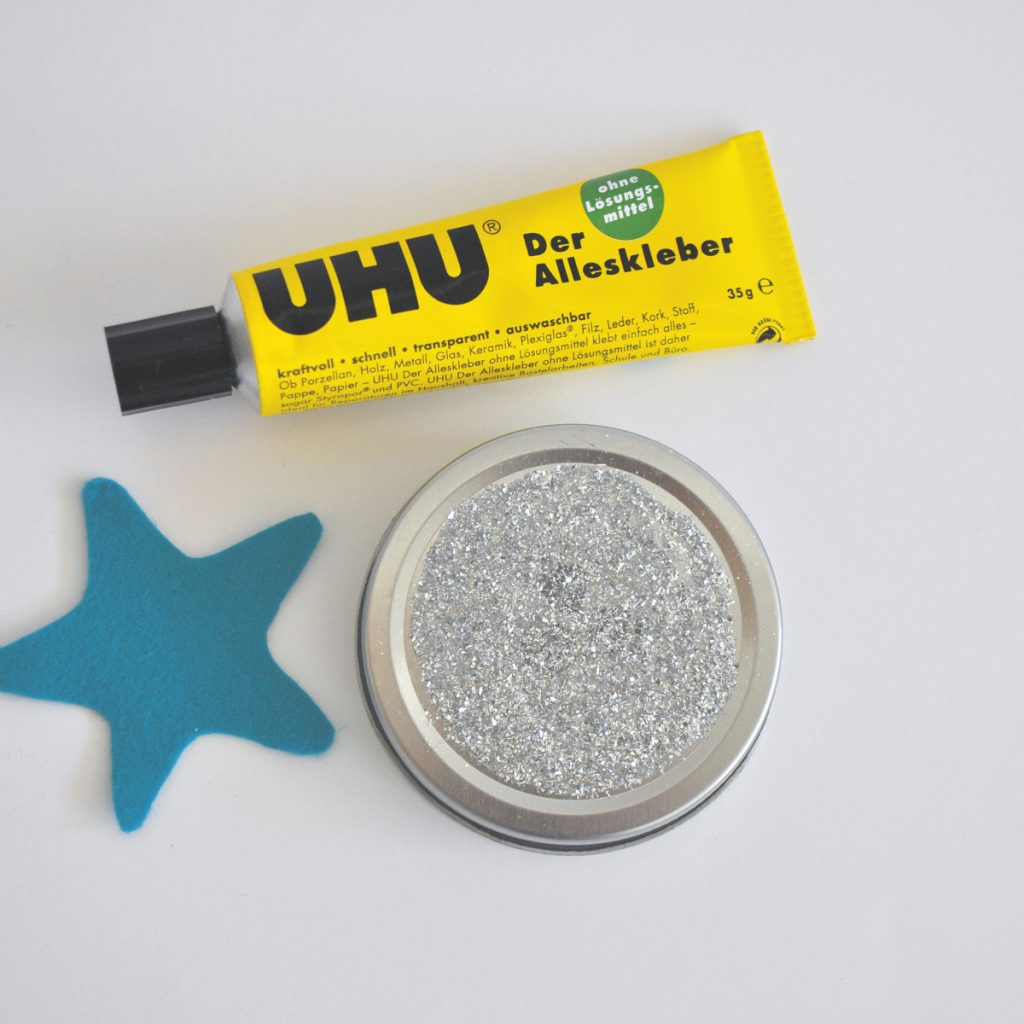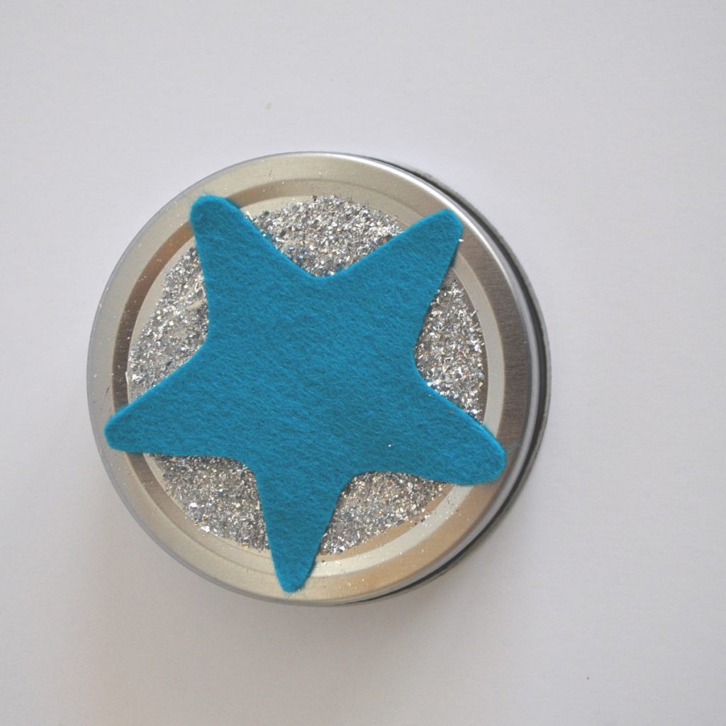3 Bestreiche den Deckel deines Glases mit Klebstoff – lass außen einen schmalen Rand – und streue Glitzer darüber. Lass den Deckel gut trocknen.