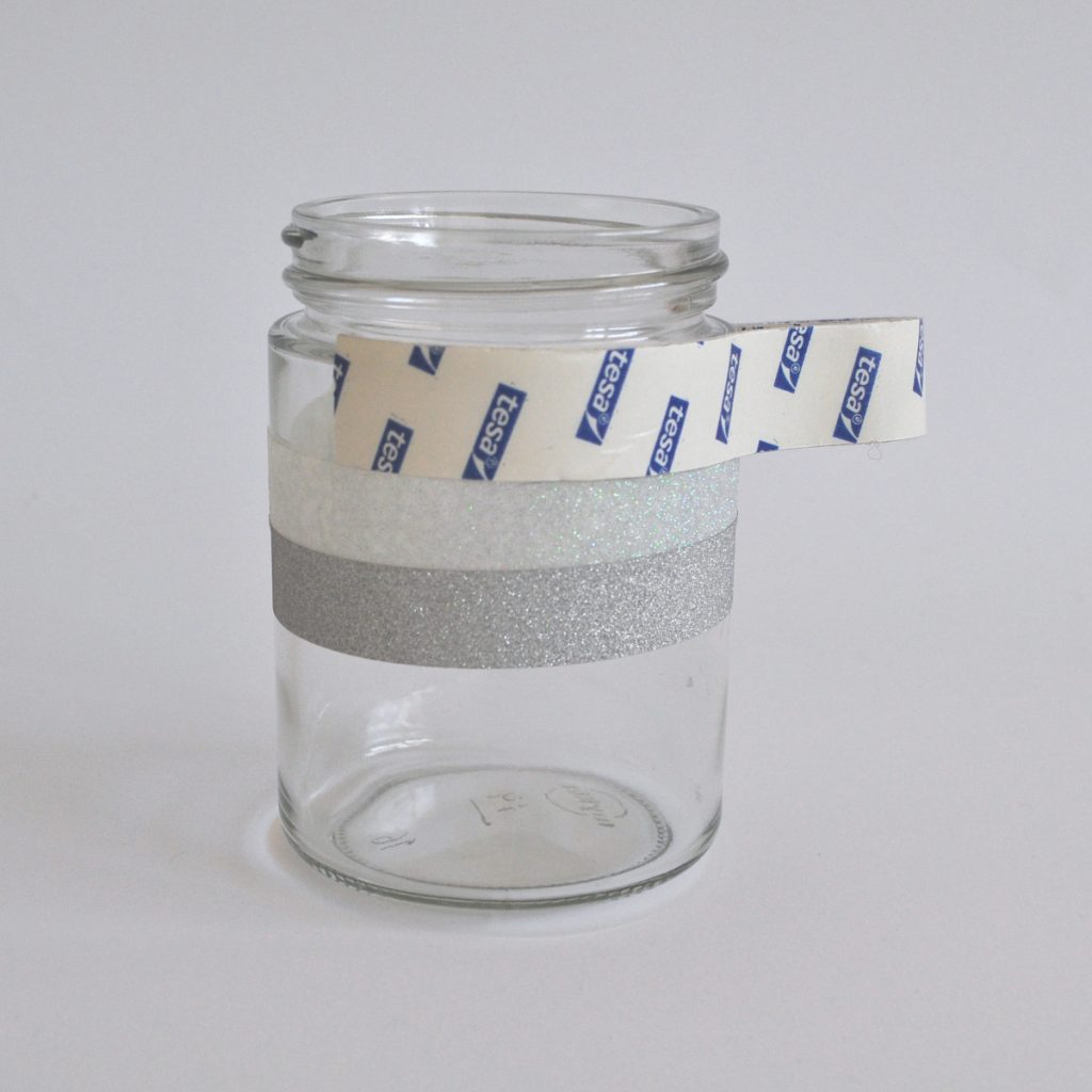 5 Bringe knapp unter dem Rand des Glases einen Streifen doppelseitiges Klebeband an und verziere das Glas mit Masking-Tape, das du rundherum anklebst.