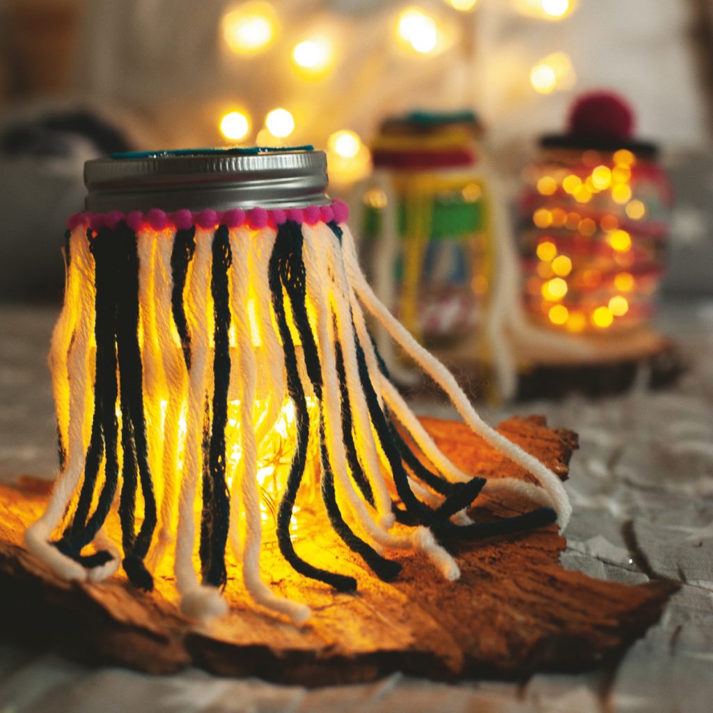 7 Lege die Lichterkette in das Glas. Achte darauf, dass der Ein-/Aus-Schalter oben ist, sodass du gut rankommst.