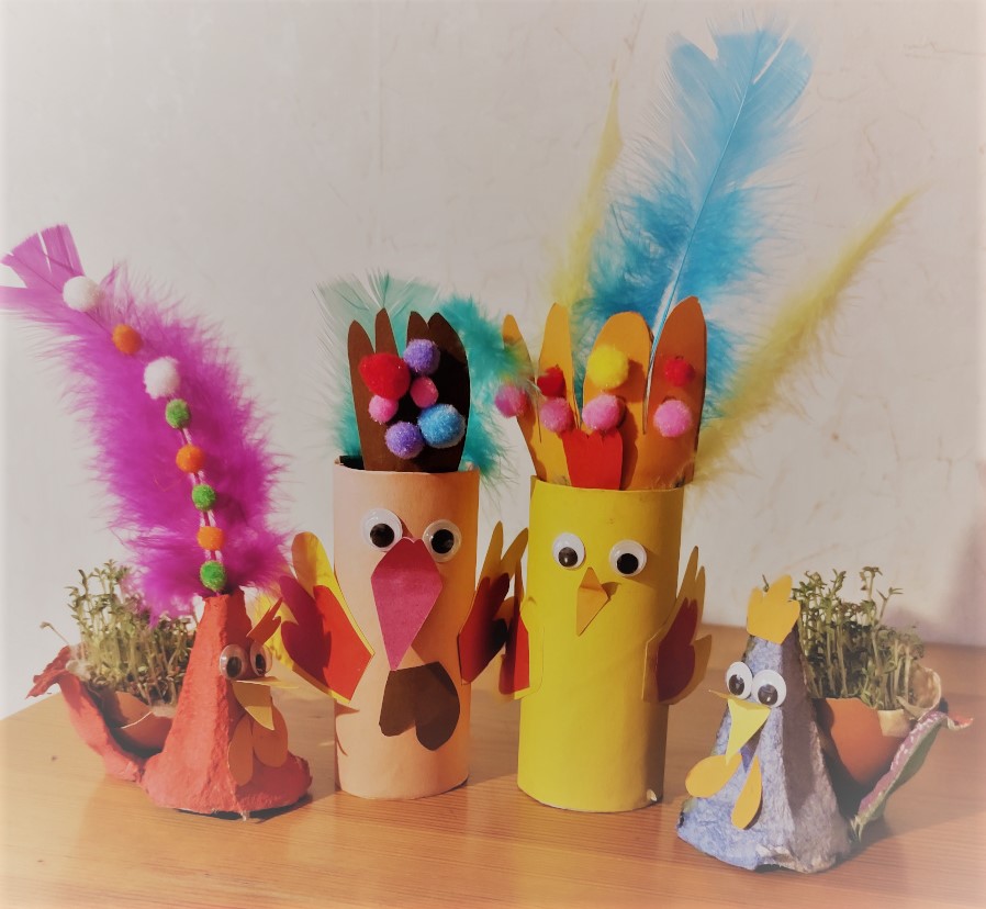 Habt ihr leere Eierkartons und Toilettenpapierrollen daheim? Super, mit wenigen anderen Materialien könnt ihr diese zu farbenfrohen Osterbasteleien verarbeiten.
