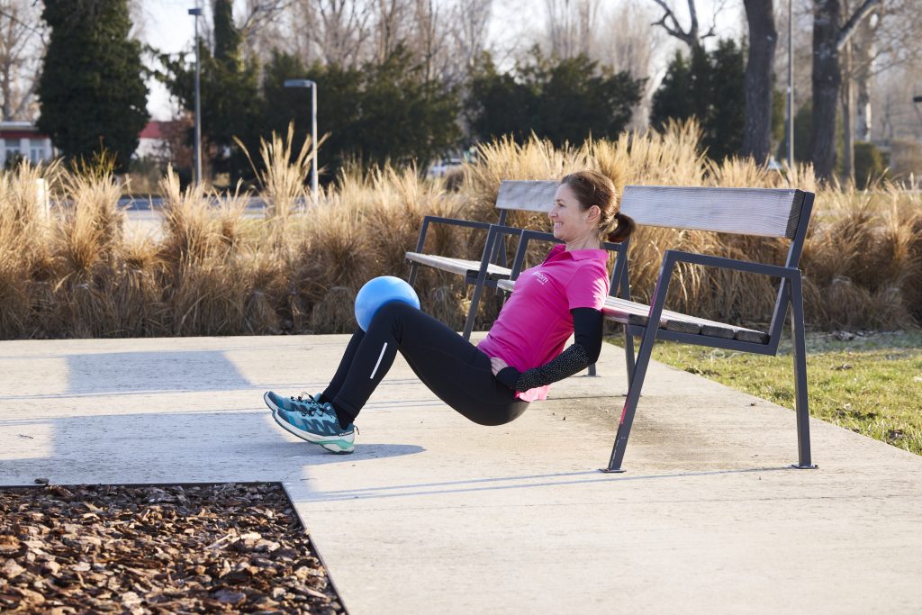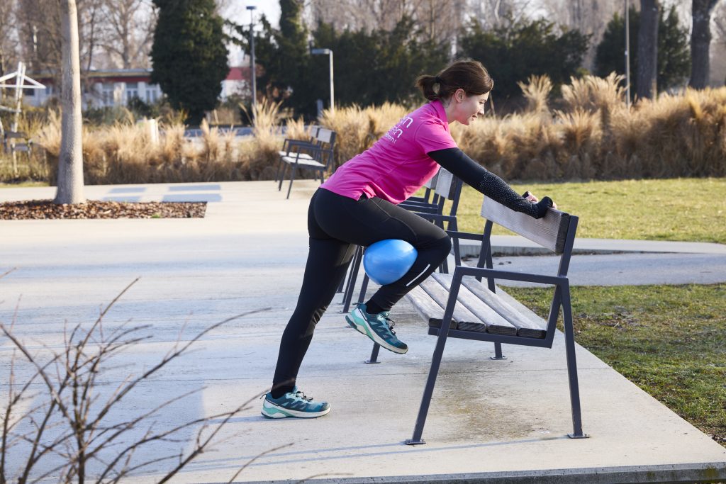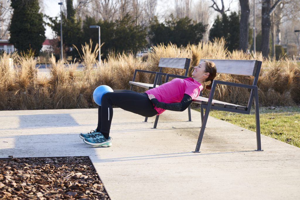 AUSFÜHRUNG: Hinhocken und den oberen Rücken unterhalb der Schulterblätter auf der Sitzfläche einer Parkbank oder Sofa auflehnen. Füße hüftbreit aufstellen. Den Ball zwischen Deinen Knien einklemmen. In dieser Rückenlage die Hüfte über die Fersen mit stabilem Oberkörper und aktivem Bauch nach oben drücken bis Oberschenkel und -körper eine Linie bilden. Gleichzeitig den Ball zwischen den Knien zusammendrücken. Gesäß aktiv anspannen, Beckenboden beim Hochkommen aktivieren. Kurz oben halten. Gesäß wieder kontrolliert absenken, und wiederholen.