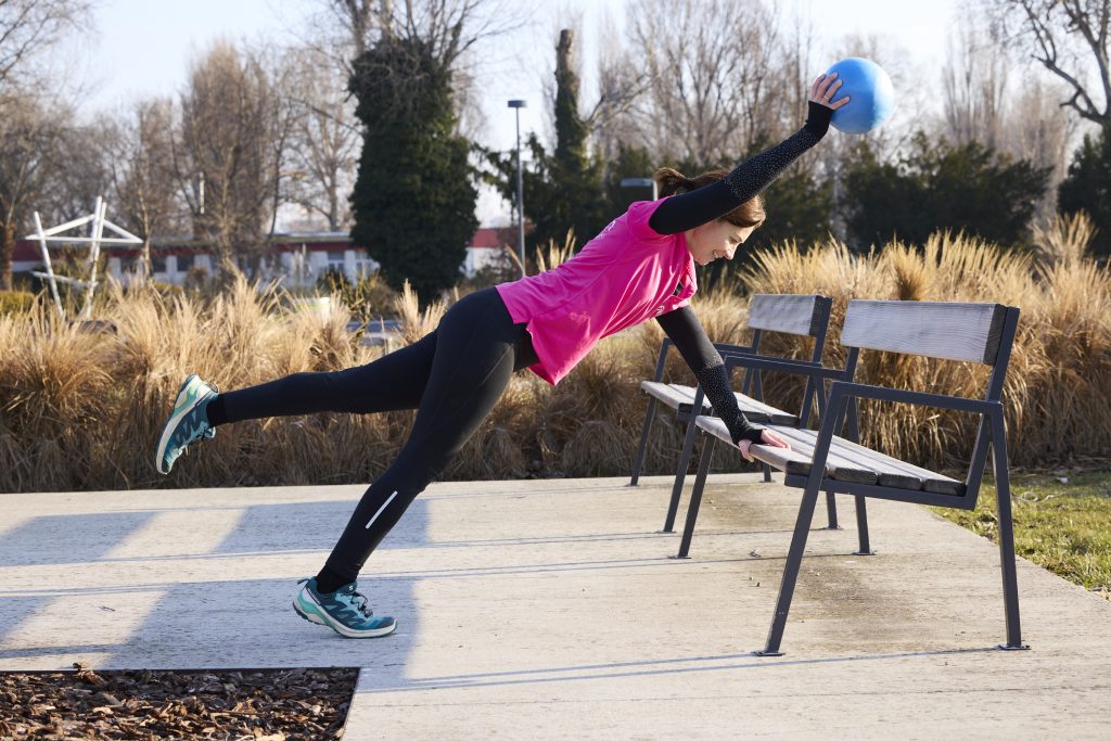 AUSFÜHRUNG: Stütze Dich in erhöhter Planken-Position in geraden Linie auf die Sitzfläche einer Bank oder eines Sofas. In einer Hand hast Du Deinen Ball. Du streckst nun die Ballhand und das diagonale Bein (Spielbein) ab. Dabei bliebt deine Körpermitte durchgehend stabil und ruhig. Aktiver Unterbauch – der Bauch trägt den Rücken. Körperspannung halten. Nun ziehst Du das Knie das Spielbeins und den Ball unter Deiner Körpermitte zusammen und presst das Knie fest gegen den Ball. Kurz halten. Ballhand und Spielbein wieder abstrecken und wiederholen. Seite wechseln.