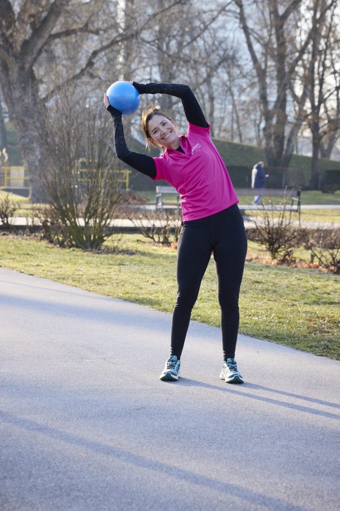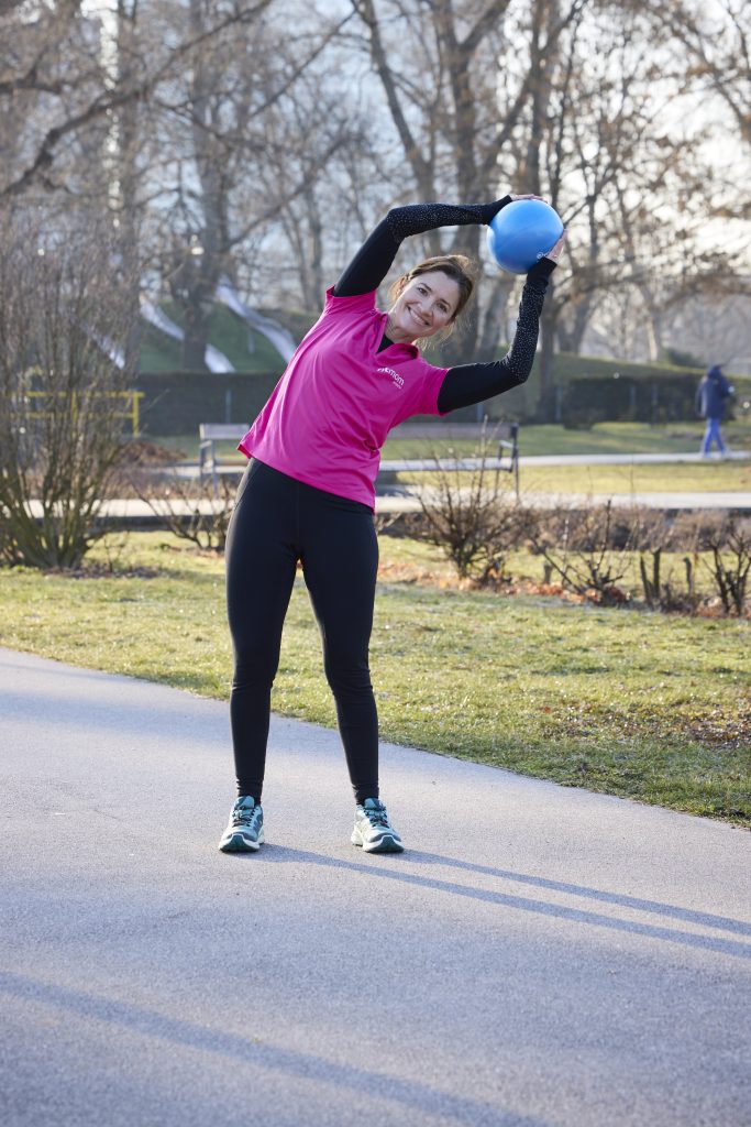 AUSFÜHRUNG: Arme kommen über den Kopf, Ball zwischen den Händen leicht zusammendrücken, Knie leicht beugen und schulterbreit hinstellen. Wie zwischen zwei Glasscheiben neigst Du Deinen Oberkörper jetzt seitlich über die Taille und drückst dabei den Ball leicht zusammen.