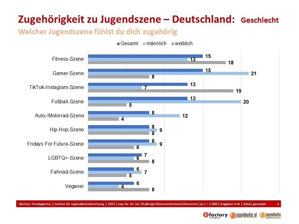 Über 70% der Jugendlichen fühlen sich einer Szene zugehörig. Die größten Szenen sind Gamer, Fitness, Fußball-Fans, Biker und Instagram/TikTok-Fans.