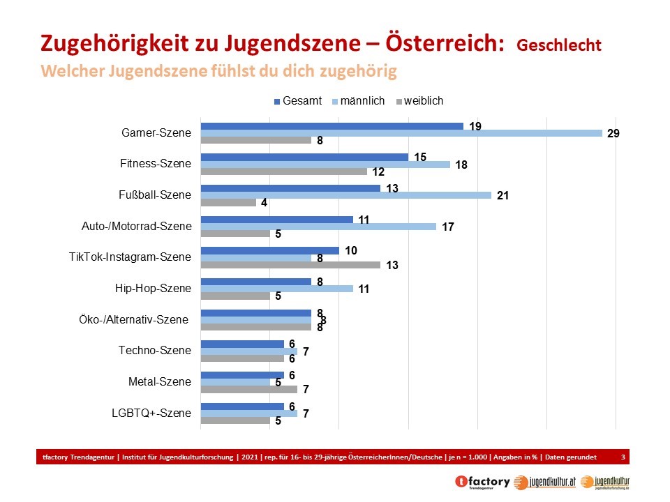 Rund 30% der jungen Männer fühlen sich der Gamer-Szene zugehörig, fast 20% der Auto-/Motorrad-Szene. Die Auto-/Motorrad-Szene ist die Szene des Jahres 2021. Das Interesse an dieser Art „traditioneller“ Mobilität hat extrem zugenommen. In einer Zeit der voranschreitenden Entindividualisierung, Kollektivierung und staatlichen Steuerung wird die Zahl der jungen Menschen, die sich demonstrativ durch ein „nicht-zeitgemäßes“ Hobby ihre Einzigartigkeit und Individualität zurückerobern wollen, wieder größer.