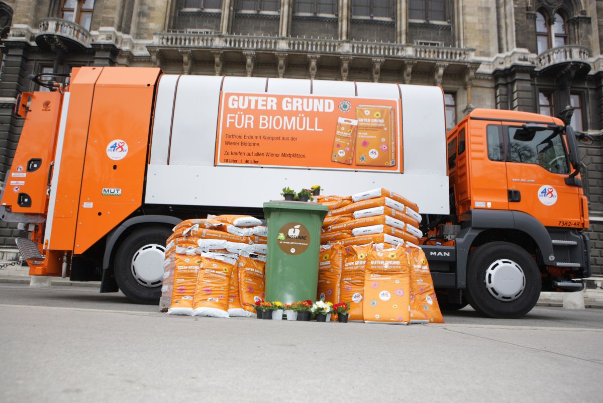 Die Erde „Guter Grund“ der MA 48 wird aus Kompost der Wiener Biotonne hergestellt und kommt ohne Torf aus. Sie ist für sämtliche Bepflanzungen im Haus- und Gartenbereich geeignet und auf allen Wiener Mistplätzen und im 48er Tandler erhältlich.