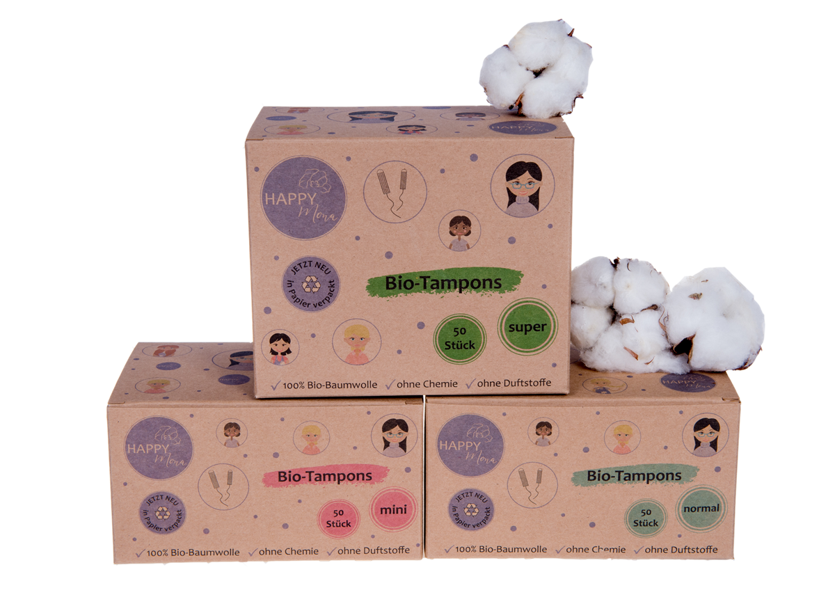 Sie bestehen aus 100 % Bio-Baumwolle, sind frei von Chemie und Pestiziden und papierverpackt: Tampons von HAPPY MONA, einem Start-up aus St. Pölten.