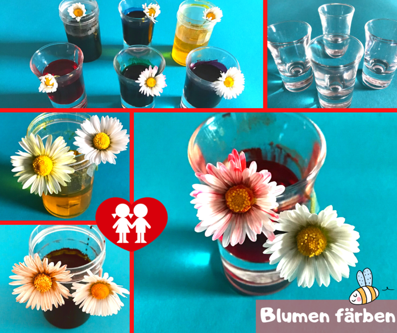 Wir färben Gänseblümchen um! Da die zarten Blumen überall so zahlreich und wunderschön blühen, werdet ihr bei einem kleinen Spaziergang bestimmt genügend davon finden. Was ihr sonst noch braucht? Lebensmittelfarbe, Wasser, kleine Gläser und ein bisschen Zeit.