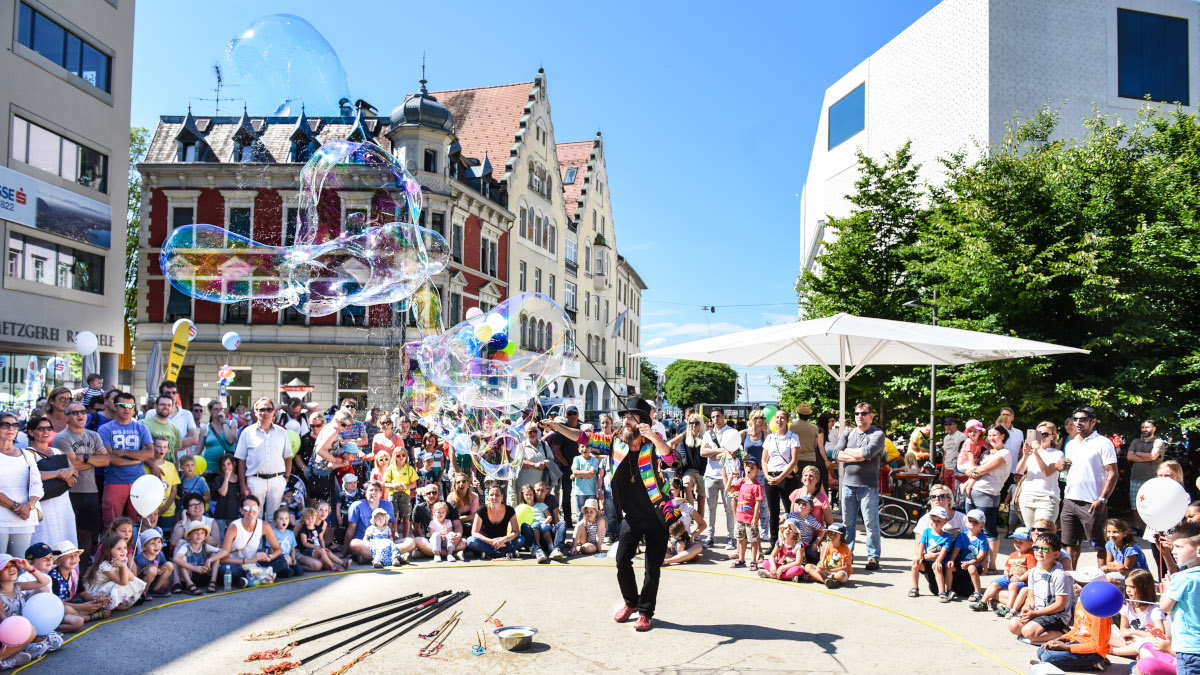 Egal, ob ihr in Bregenz und Umgebung wohnt oder Urlaub macht, das solltet ihr euch nicht entgehen lassen: Den ganzen Nachmittag lang wird die Innenstadt zu einem riesengroßen Spielzimmer mit Gauklern, Clowns, Seifenblasenkünstlern und vielem mehr.