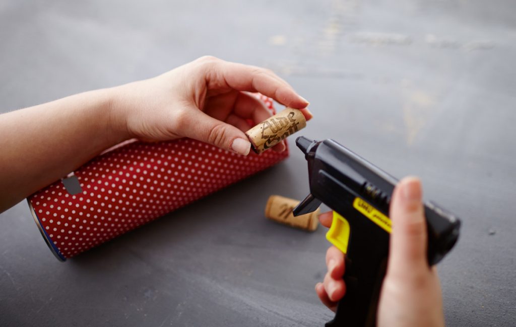 Als Füße drei Wein-Korken unter die Dose kleben.