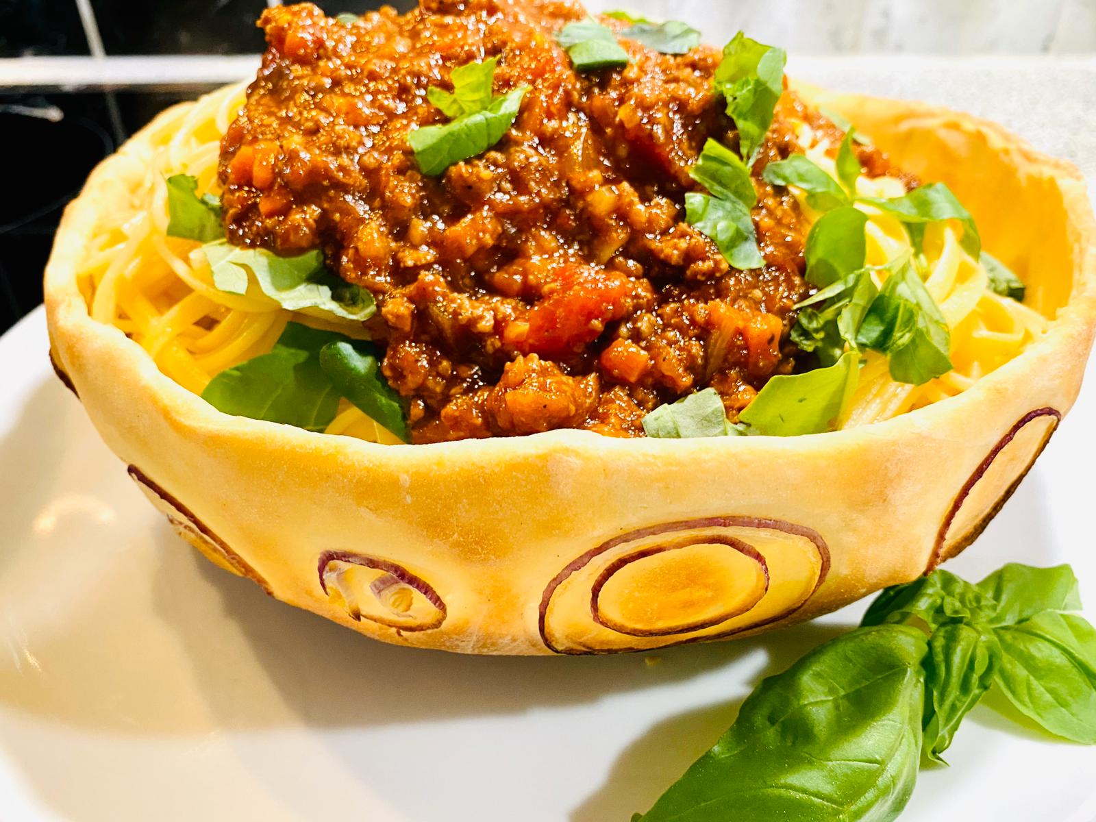 Dann teilt man den Teig in zwei Hälften. Nun wird der Teig schön dünn ausgerollt. Das macht dann auch den Kindern Spaß. Dann legt man den Teig über den Topf und schneidet vorsichtig mit dem Messer den Rest weg sodass es wie eine schöne Schüssel aussieht. Jetzt kann man den Teig noch mit den Zwiebelringen verzieren und danach im Rohr am Gitterrost bei 200° Grad ca. 15-20 Minuten backen. Einfach nach gewünschter Farbe herausnehmen und abkühlen lassen. Danach kann man den essbaren Topf vorsichtig vom Backpapier lösen. Nun rollt man den zweiten Teig schön dünn aus und mit einem Teller als Vorlage schneidet man einen runden Kreis aus. Mit etwas Teig kann man Griffe formen und mit dem Messer ein Muster rein schneiden. Käse darauf verteilen, mit etwas Kräutersalz würzen. Dann kann man auch den Deckel im Rohr knusprig backen. Der schmeckt übrigens hervorragend mit dem Käse. Wenn beide Teile gebacken sind, sollte die Pasta fertig und das Sugo schön aufgewärmt sein.