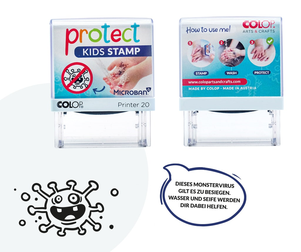 Der „Protect Kids Stempel“ ist hautverträglich und dermatologisch zertifiziert. Bis zu 3.000 Abdrücke schafft ein Stempelset. Damit sollten Eltern mit ihren Kindern gut durch die Coronakrise kommen. Im Stempel selbst ist Microban®-Technologie eingearbeitet, die ihm Schutz gegen schädliche Mikroben gibt und das Wachstum von Bakterien während der gesamten Lebensdauer des Stempels hemmt. Gegen Viren und deren Verbreitung hilft das allerdings nicht. Da bleibt nur das bewährte Händewaschen und Abstandhalten.