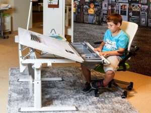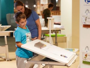 Die Schreibfläche zum Kippen fanden Johannes und Mama Elisabeth sehr praktisch.