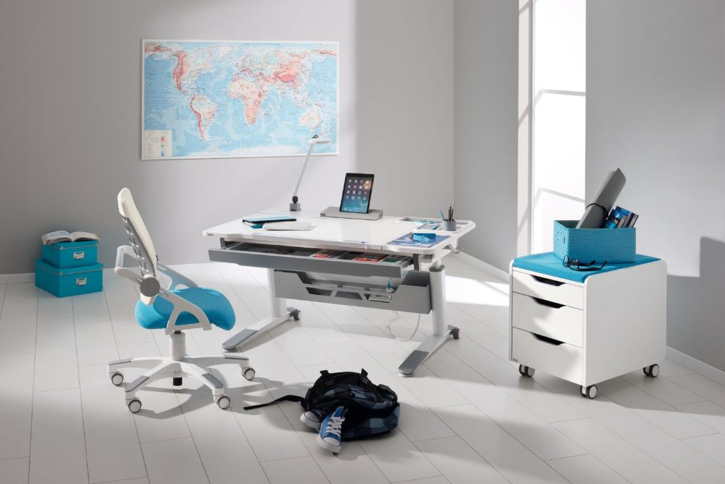Der deutsche Kindermöbelhersteller PAIDI ist bekannt für hohe Verarbeitungsqualität und die zahlreichen sinnvollen Details, die seine Möbel zu besonders funktionellen Einrichtungsstücken machen. So lässt sich beim Diego GT die Tischplatte kippen, was Schreibarbeiten beim Volksschulkind deutlich erleichtert. Und Johannes freut sich, dass es für das Stromkabel des Notebooks einen eigenen Kabelschacht gibt. Der Clou: Der PAIDI Diego GT wächst mit dem Kind mit und lässt sich mittels Kurbel ganz leicht auf die jeweilige Körpergröße des Kindes einstellen.