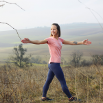 Ausführung: Hüftbreiter Stand, Knie minimal gebeugt, Arme auf Schulterhöhe zur Seite gestreckt, Ellbogen leicht gebeugt, Handflächen schauen nach oben. Schultern entspannt halten. Mit dem Einatmen die Daumen weiter nach hinten ziehen, Brustkorb öffnen und Schulterblätter zusammen ziehen. Mit dem Ausatmen die Arme nach vorne ziehen, Handrücken schauen zueinander. Oberen Rücken rund machen und die Schulterblätter weit auseinander ziehen.