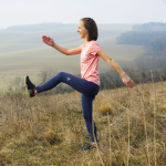 Ausführung: Rechtes Bein ist das Standbein und wird minimal gebeugt. Das linke Bein vom Boden abheben und locker nach vorne und nach hinten schwingen. Arme diagonal dazu mitschwingen. Rücken bleibt lang und aufrecht. Tipp: Für ein besseres Gleichgewicht einen fixen Punkt anvisieren.