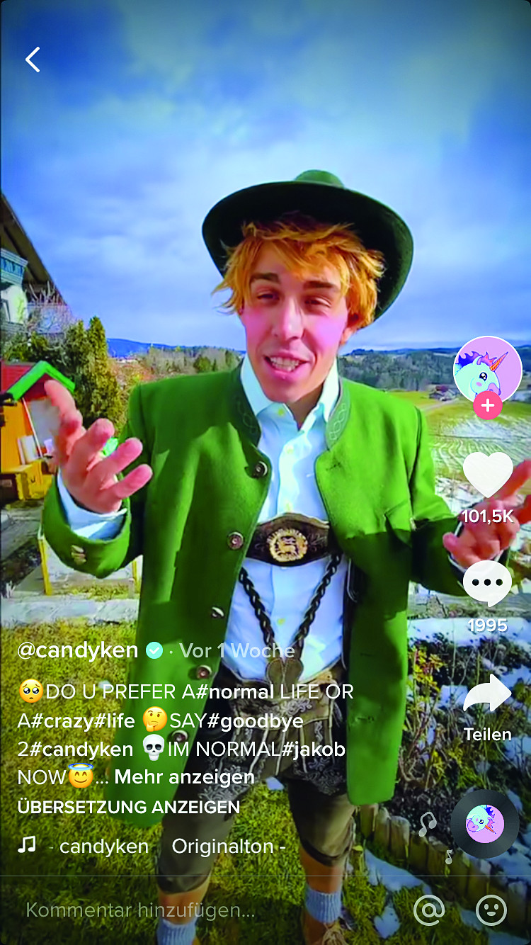 Auf TikTok tun sie und viele andere mit Millionen von jugendlichen Followern nicht nur ihre Meinung kund. Wie auch bereits auf YouTube und Instagram preisen sie, teils offensichtlich, teils gut verborgen, Produkte an und verdienen gut an diesem Influencer- Marketing. Auch österreichische TikToker können sich über durchaus hohe Follower-Zahlen freuen: Österreichs TikTok-Star ist Candy Ken aus Vorarlberg. Für seine schrägen Videos bekannt in denen er gerne in schrillen Kostümen auftritt, ist Jakob Kasimir Hellrigl, so der bürgerliche Name des 28-Jährigen, über Österreichs Grenzen hinweg bekannt – auf TikTok folgen ihm bereits 6,5 Millionen Menschen.