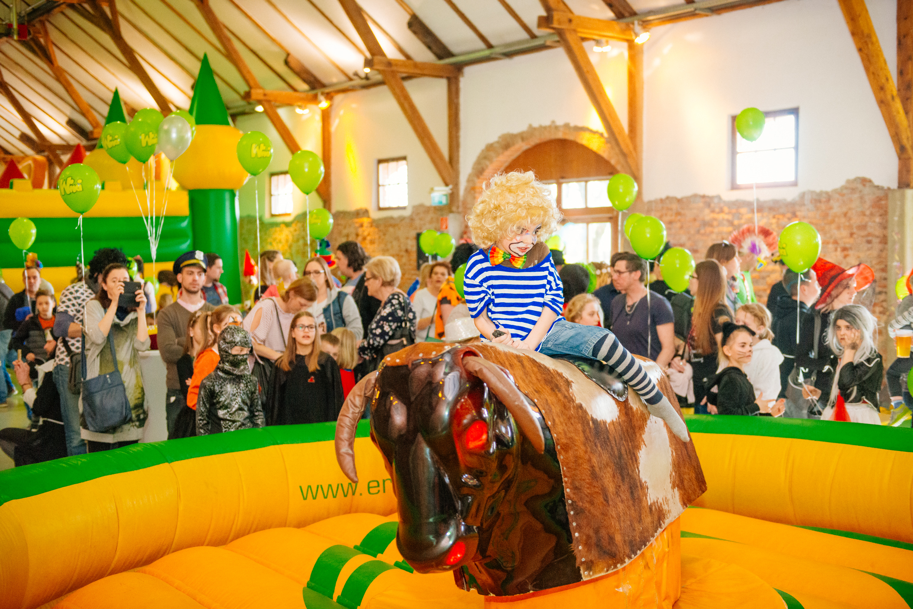 Seit mehr als 20 Jahren veranstaltet WIKI den WIKI-Erlebnisfasching, der heuer zum ersten Mal in der Grazer Seifenfabrik stattfindet – einer Location, die durch ihre Größe tolle Möglichkeiten für Indoor-Aktivitäten für zahlreiche Gäste bietet. Bereits Minuten nach dem Einlass ist klar: Das wird heute ein richtig großes Fest, denn die Hallen brummen bereits. Innerhalb kürzester Zeit werden die Spiel- und Mitmachstationen schon eifrig genutzt: In einer weiteren Halle sorgen eine Torschuss- und eine Kletterwand für Action, während die Station mit Bobbycars und Reittieren von den kleineren Gästen befahren wird. In der Markthalle werden bereits die ersten Hot Dogs und Pommes verspeist und Popcorn, Zuckerwatte und Krapfen warten auch schon auf hungrige kleine Faschingsgäste. Es dauert nicht lange, bis auch im Elterncorner die ersten Füße hochgelegt werden – das Leistungselixier von Dr. Böhm für müde Eltern findet dort bereits reißenden Absatz, aber das tut der Energie der Kleinen natürlich keinen Abbruch. In der großen Fachwerkhalle werden die Hüpfburgen behüpft, dass die Wände wackeln. Und auch der Rodeobulle dreht seine ersten Runden, während die Omis von Omi’s Apfelstrudel gemeinsam mit kleinen Prinzessinnen, Cowboys und Indianern die ersten Kekse verzieren und der Kids-DJ die besten Kinderhits auflegt und beim KNAX-Gewinnspiel ein Tresor geknackt wird. Dazu kommen noch Basteln, Dosenschießen, Minigolf, Eishockey mit den 99ers, Kinderschminken, Ballontiere, Geschicklichkeitsparcours und eine Foto Booth für die schönsten Erinnerungen an die tolle Faschingsparty.