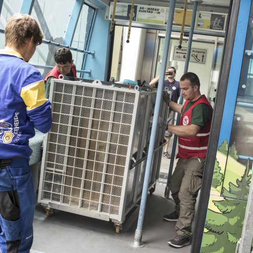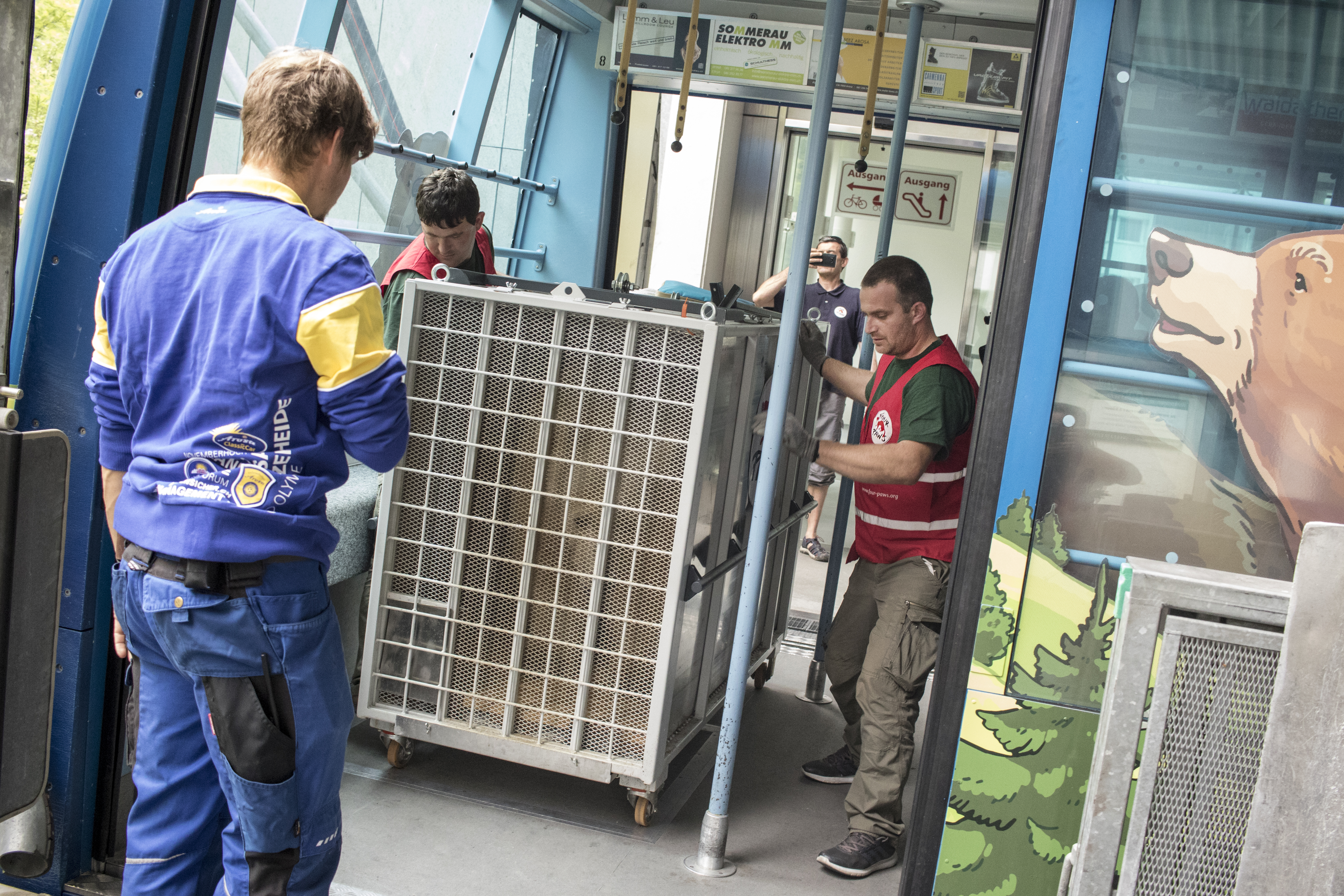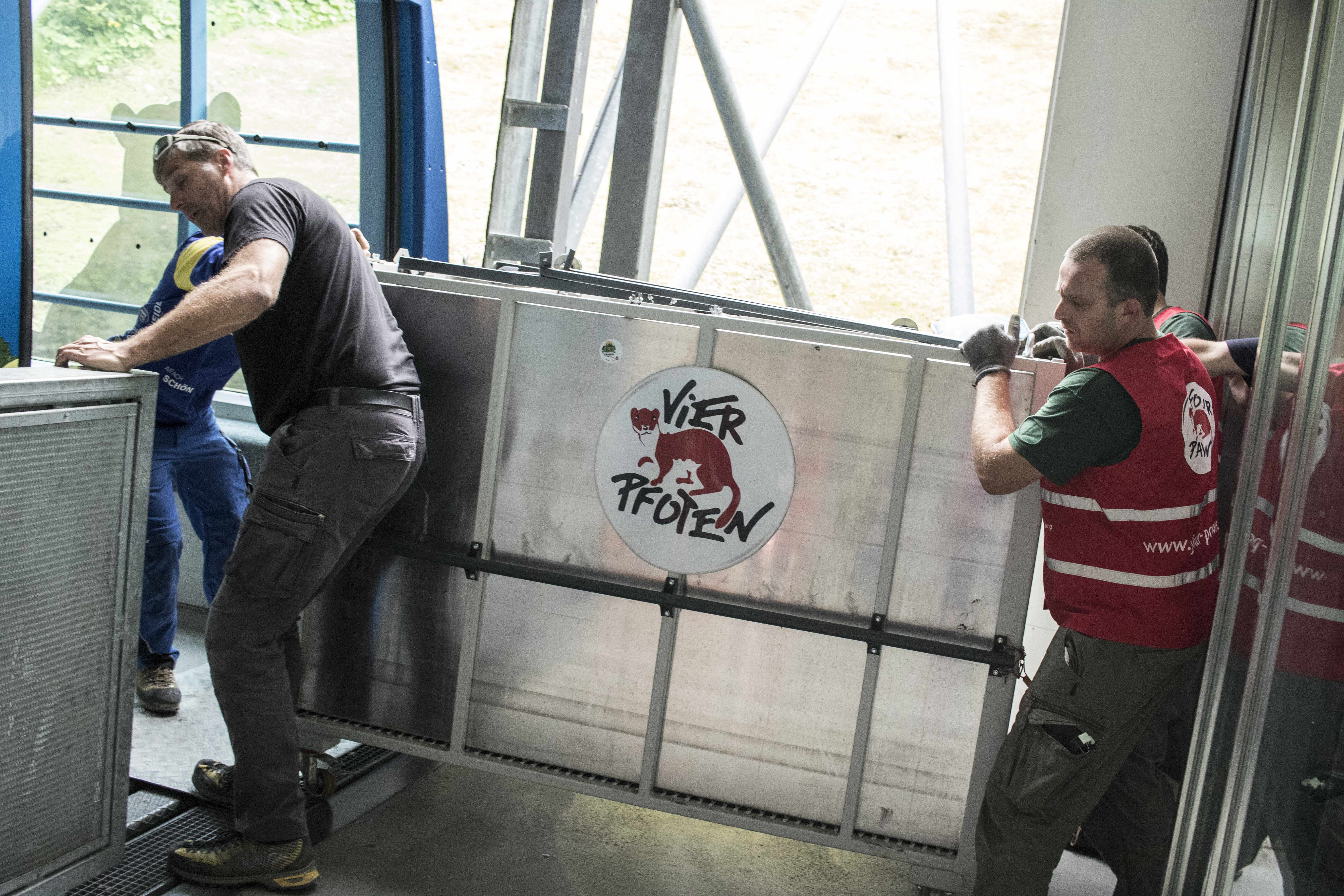 Nach rund 1400 Kilometern, 28 Stunden Transportzeit und einer Gondelfahrt war es endlich geschafft: Napa kam am Mittwoch wohlbehalten in seinem neuen Zuhause an. Seine Reise begann am Tag zuvor im Zoo Palic in Serbien, wo er seit Oktober 2016 übergangsweise untergebracht war. Nachdem er dort von VIER PFOTEN-Tierärzten betäubt und anschließend in die Bärenambulanz verladen worden war, trat er in dem speziell für Langstreckentransporte von Wildtieren eingerichteten Auto die Fahrt in ein besseres Leben an. Eine Klima- und Belüftungsanlage und regelmäßige Checks während der Fahrt durch den behandelnden Tierarzt stellten sein Wohlbefinden sicher. Ab der Ankunft in Arosa gab es für das Team allerdings einige Herausforderungen zu meistern. „Der Transportkäfig wog mit Napa rund 550kg. Diesen von der Bärenambulanz in die Gondel zu befördern, war eine logistische Meisterleistung. Ich bin sehr froh, dass alles so gut verlaufen ist und Napa endlich in seinem endgültigen Zuhause angekommen ist“, so Carsten Hertwig, VIER PFOTEN Bärenexperte.